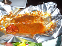 Preparing for the long haul, Hector and Marg took their time and enjoyed the free Poppadoms, two apiece, thank you. Our starter came within a most acceptable time, which meant there was again rumblings from the adjacent tables. It appeared the waiters were doing their utmost to make up for the poor experience so far. Haddock baked in foil, with a roasted tomato was the starter. It was somewhat wet and not particularly impressive. Since this Blog began we have not been to Mother India’s Café along the road where the Machi Masala is to die for…