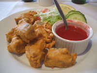 The menu was brought and there was a plethora of Chicken. The usual, – we can prepare any of the above in Lamb or King Prawn – was not evident. I was about to select a Seafood Combination when the waiter made the ultimate offer: the chef is happy to cook to order – …so…Lamb, dry sauce, herbs, reasonably hot…was the order. The waiter wrote nothing down. A Vegetable Pilau Rice was to be the accompaniment. Squid Pakora! Hector has never experienced this, so at the risk of being too full, this had to be included.