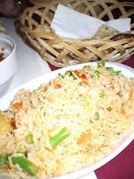 The accompanying Vegetable Rice was sold as a Vegetable Biryani. The Garlic Nan was presented sliced.