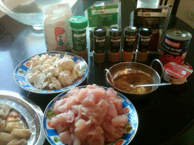 Somehow all the spice ingredients for a Curry materialised in my basket. The Chicken did look strange, it cannot be Halal, but it was certainly Kosher! A cauliflower was purchased at the Ichud shop next door as an – interesting vegetable.