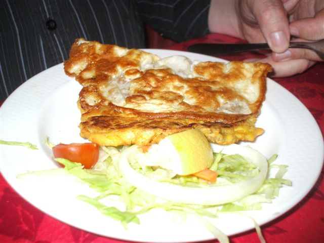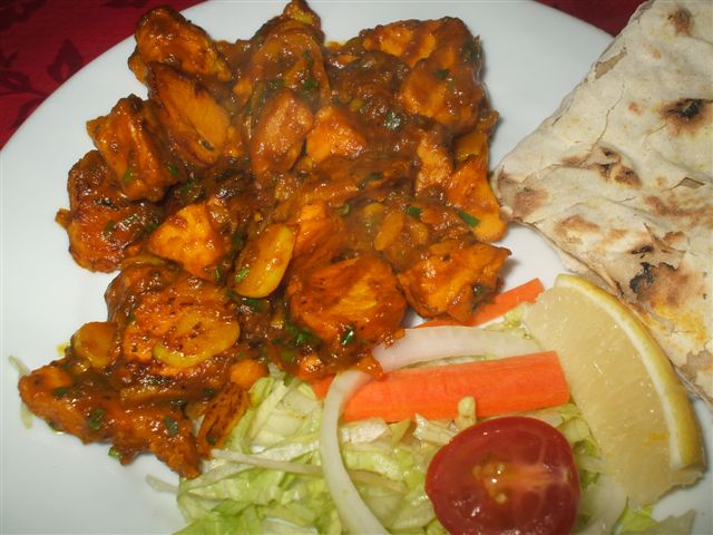 Hector ordered a starter too (English portions!): Chicken and Garlic served on a Chapatti. The Chapatti was folded in quarters and the Chicken-Garlic mix sat adjacent. Where was the taste? How could these ingredients sit on a plate and have no taste at all. The Chapatti, somewhat withered around the edges, tasted as it should so it was not me that was at fault. Now Hector normally does not have a Bier with a Curry: in this company it is traditional. A small bottle of Kingfisher is not designed to kill off the taste of Curry, I believe.