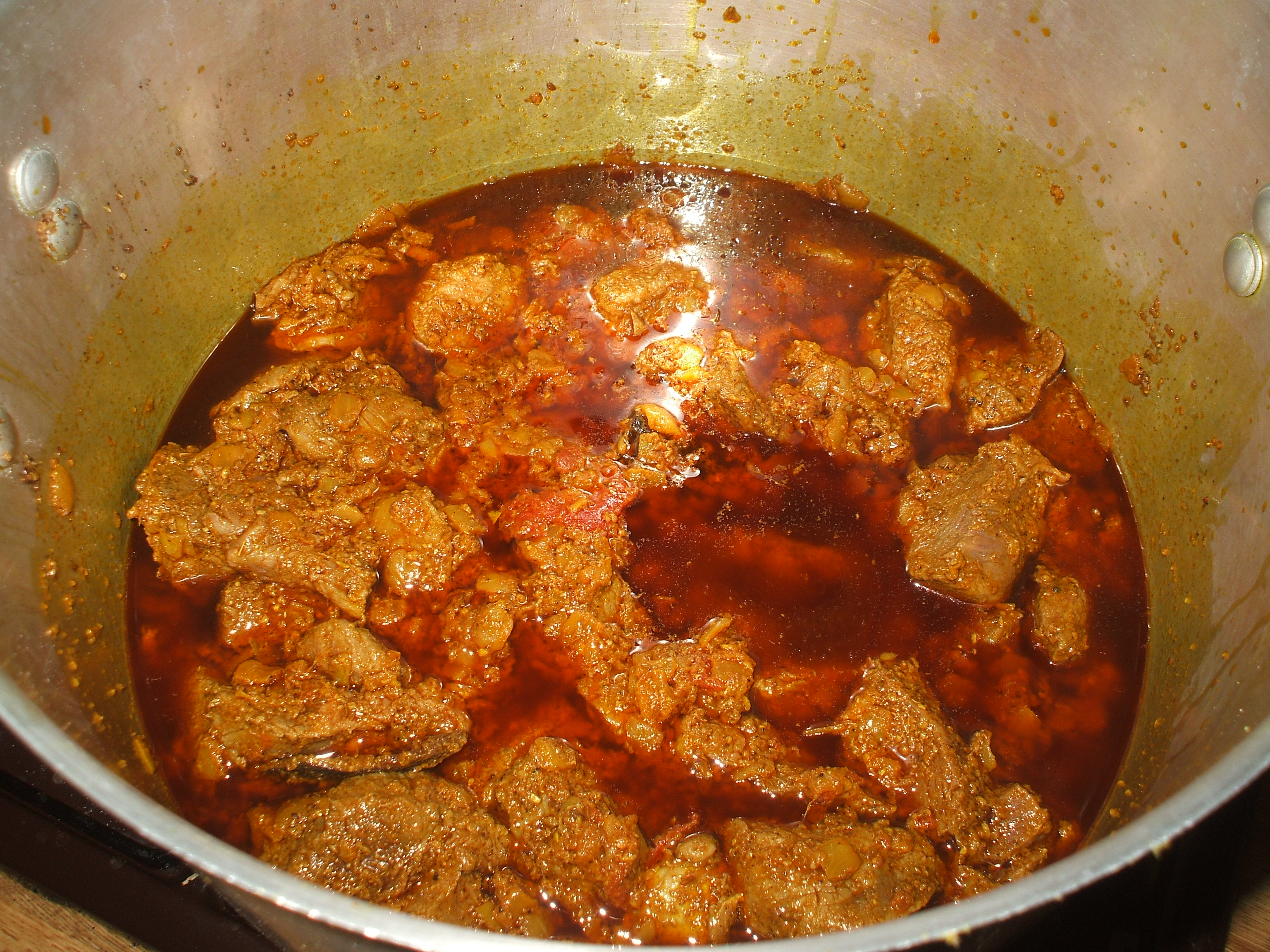 The Aloo-Dudi-Gosht has been maturing for 40 hours. The adjacent photograph shows the state as of Thursday evening – the Lamb beginning to absorb the magnificence of the two separate blends of spices and herbs: one for the Onions, one for the Meat. The Vegetables are to be added twenty minutes before serving. This is not for babies.