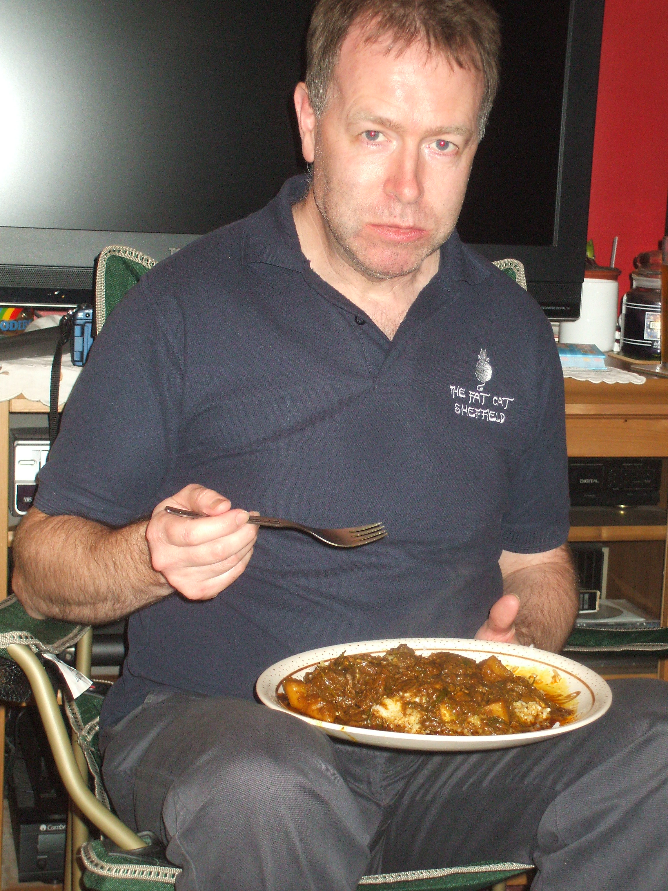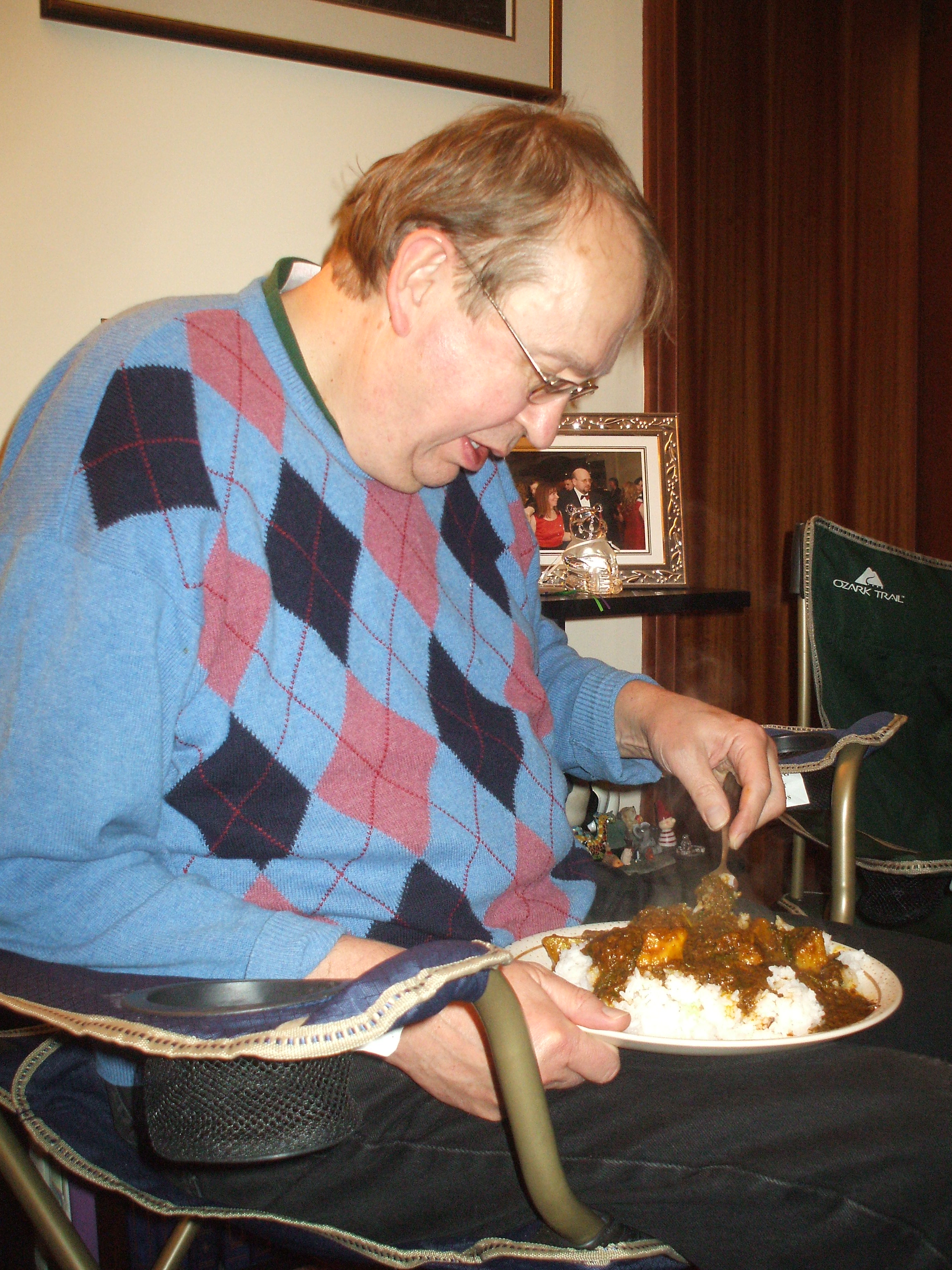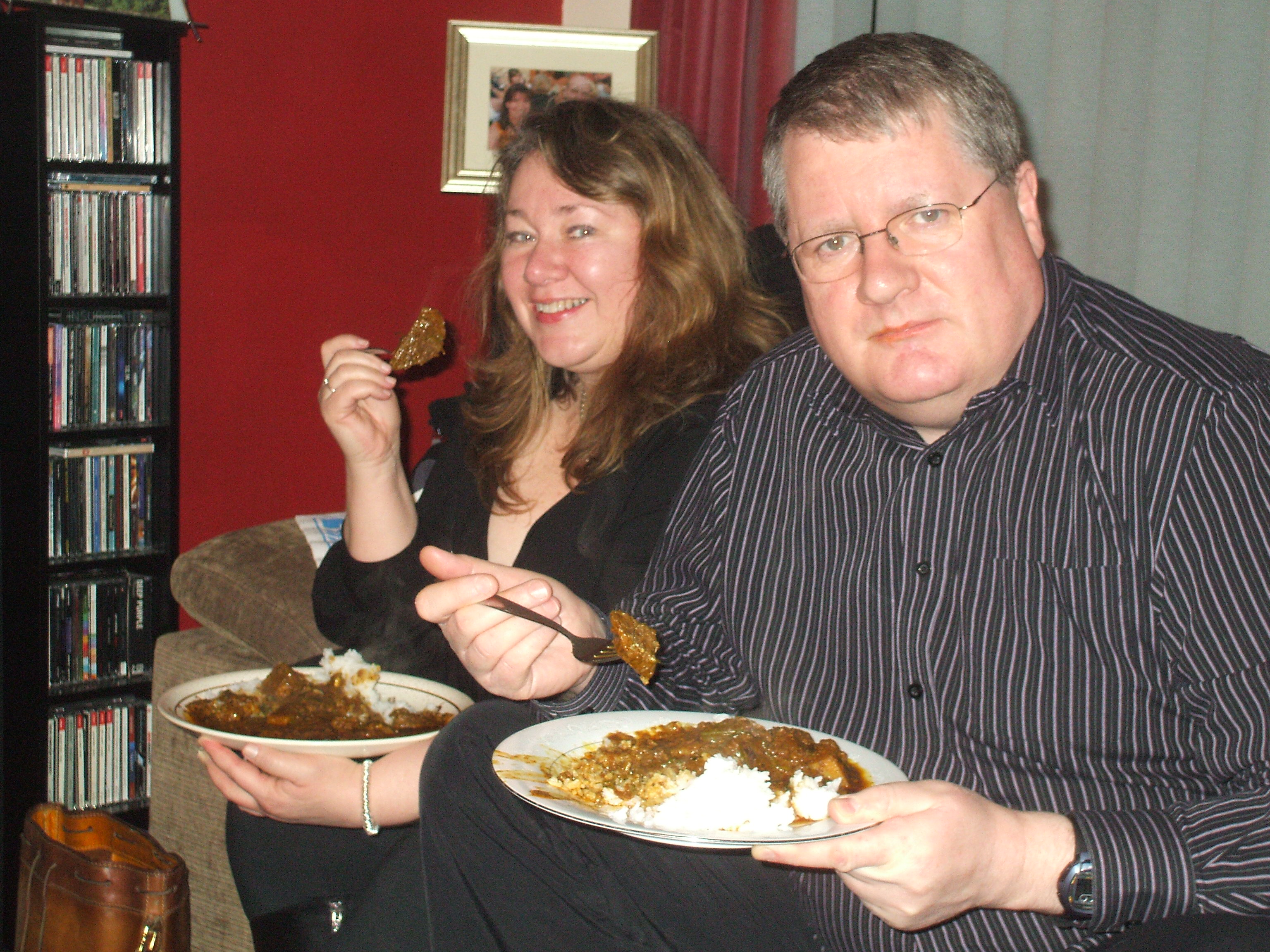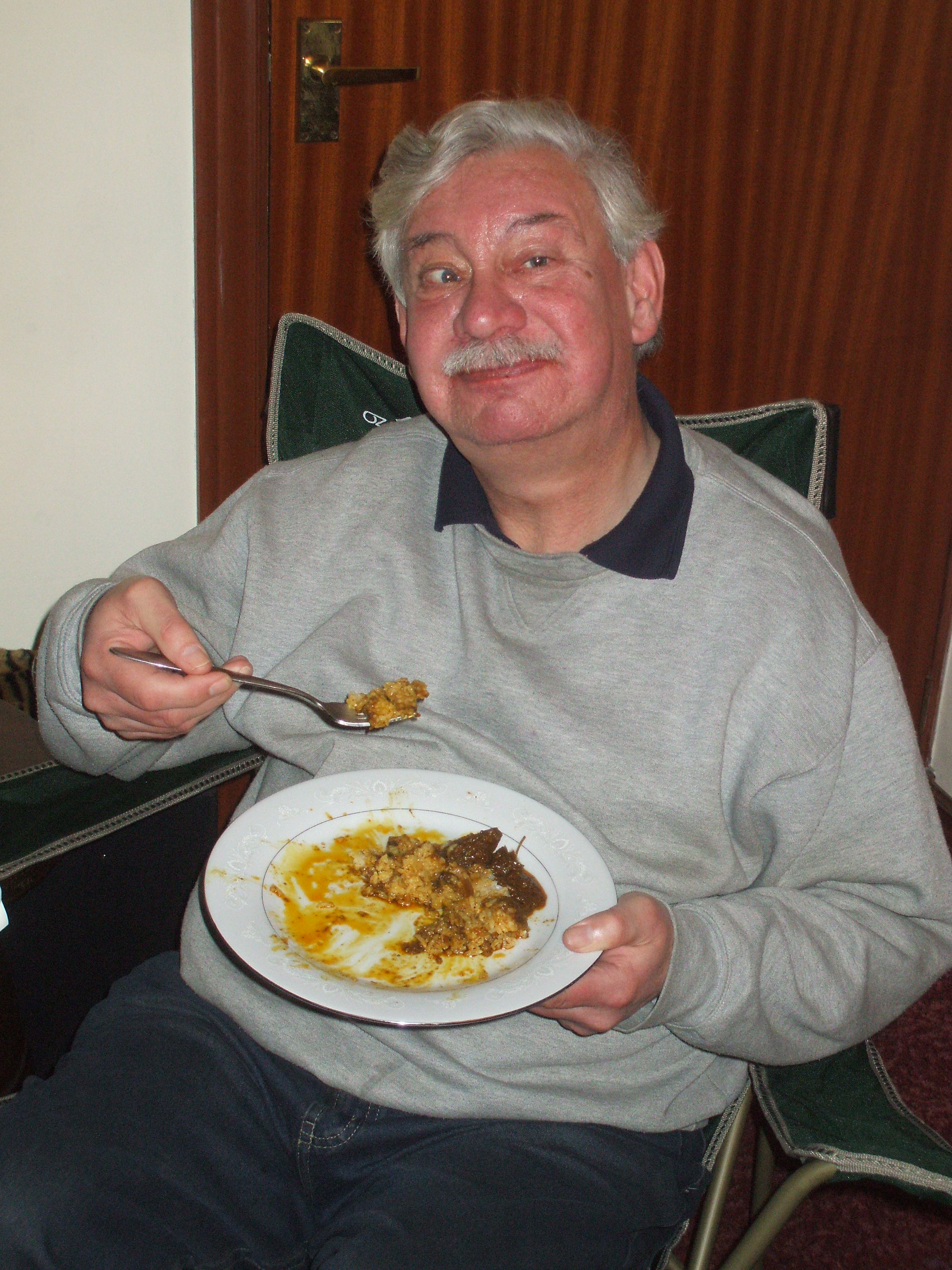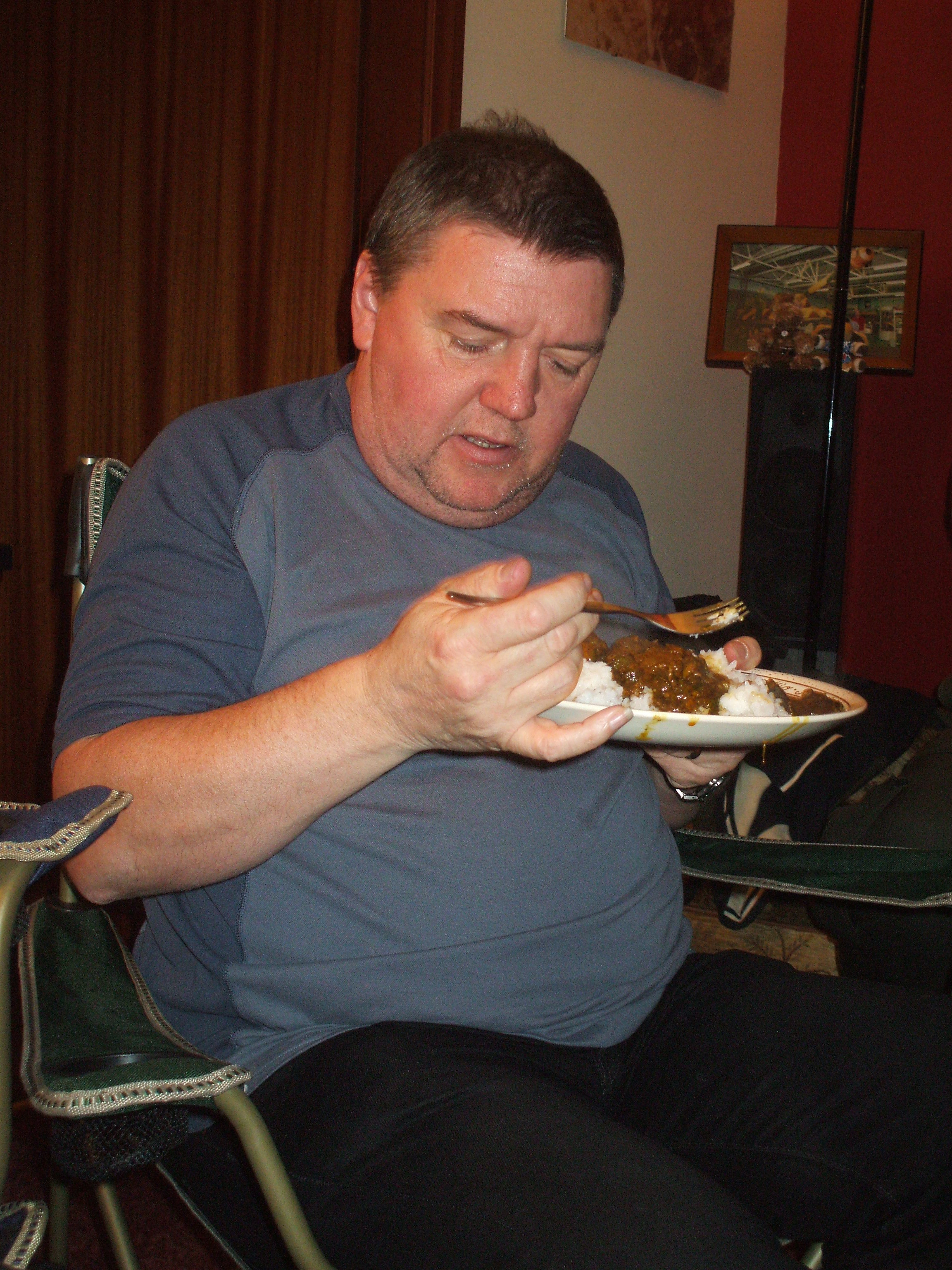 as last to emerge from the kitchen. There had been strange noises, was he lying on the floor in agony? Apparently he was wrestling with the Rice spoon. Craig ate his meal, slowly. He liked his Curry, and went back for more. This Curry was certainly not for babies.