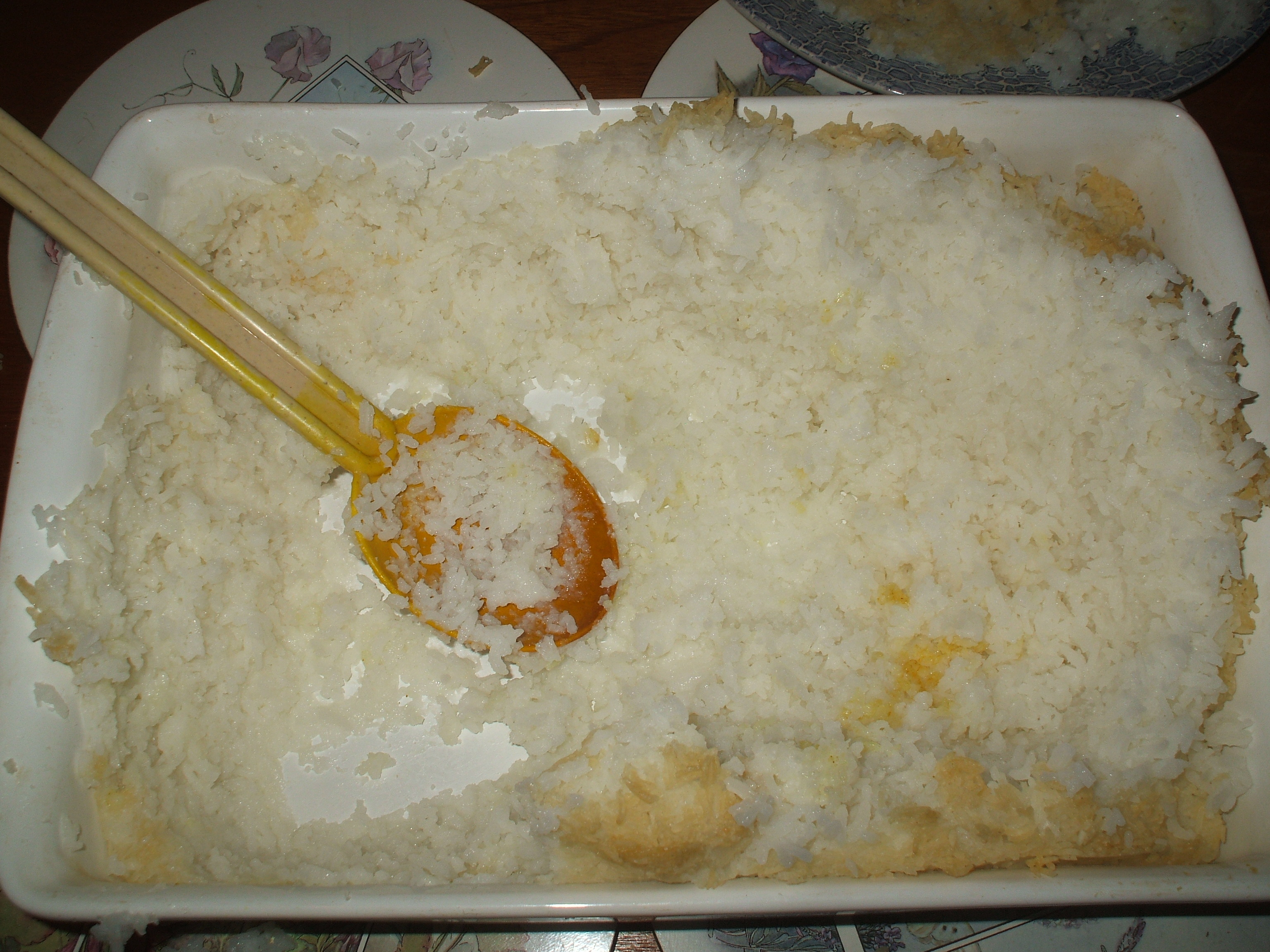 The Rice was rinsed in running water for a full ten minutes, still the starch persisted. On cooking it looked ok but after rinsing it was evident that a stodgy mess was all that could be expected. The Rice was kept warm and dry in the oven all afternoon. Tracey said she likes Rice this way. Tomorrow Hector will go back to KRK (Woodlands Rd) where I get my supplies and hope that this time the shelves are not bare – Basmati please.