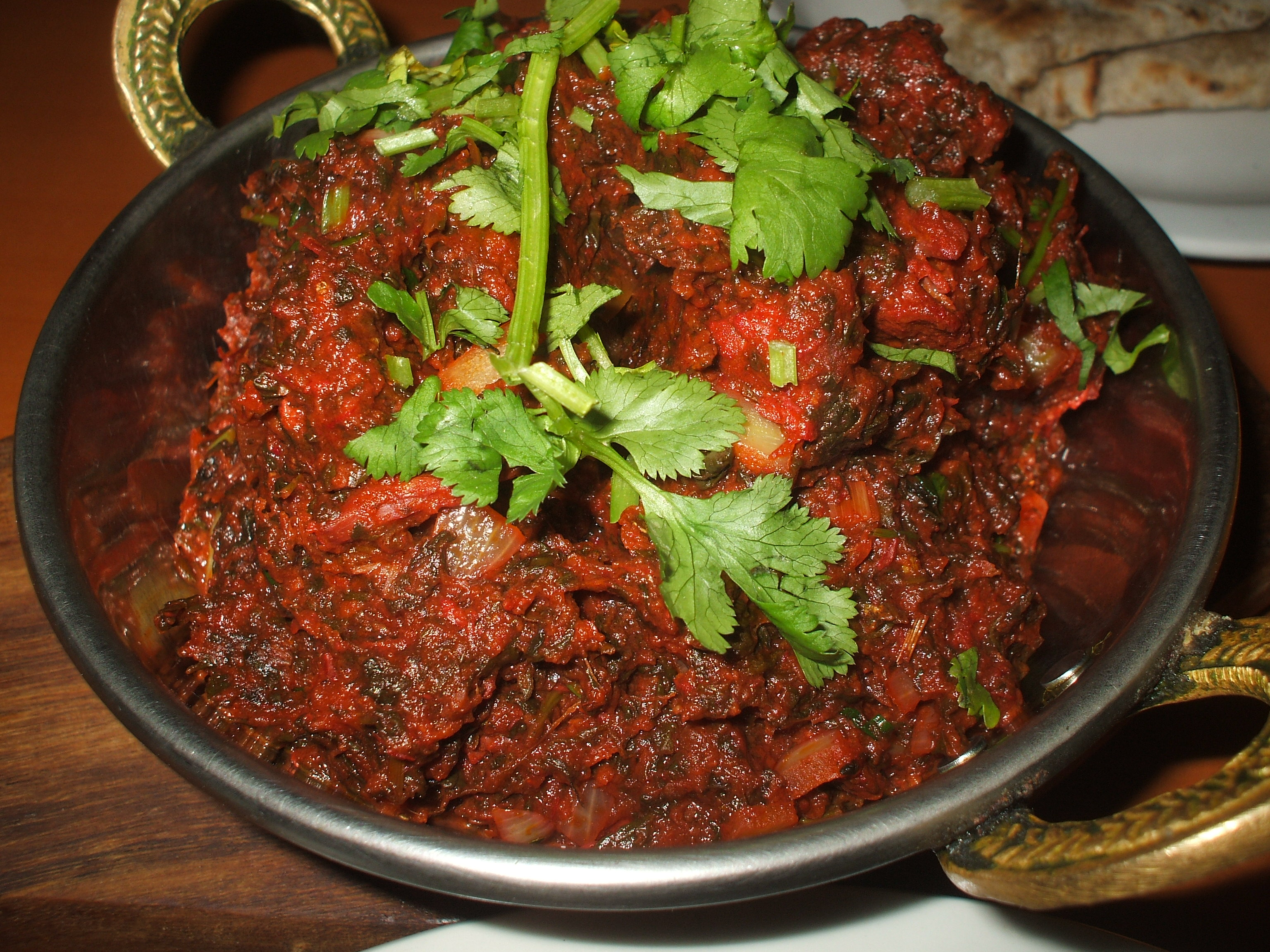Once again the place was quiet, I was the only customer. The meal came quickly and the appearance was stunning. This was another thick, very thick Masala with not too much Spinach and some fresh Coriander draped over the top. Hector tore in…