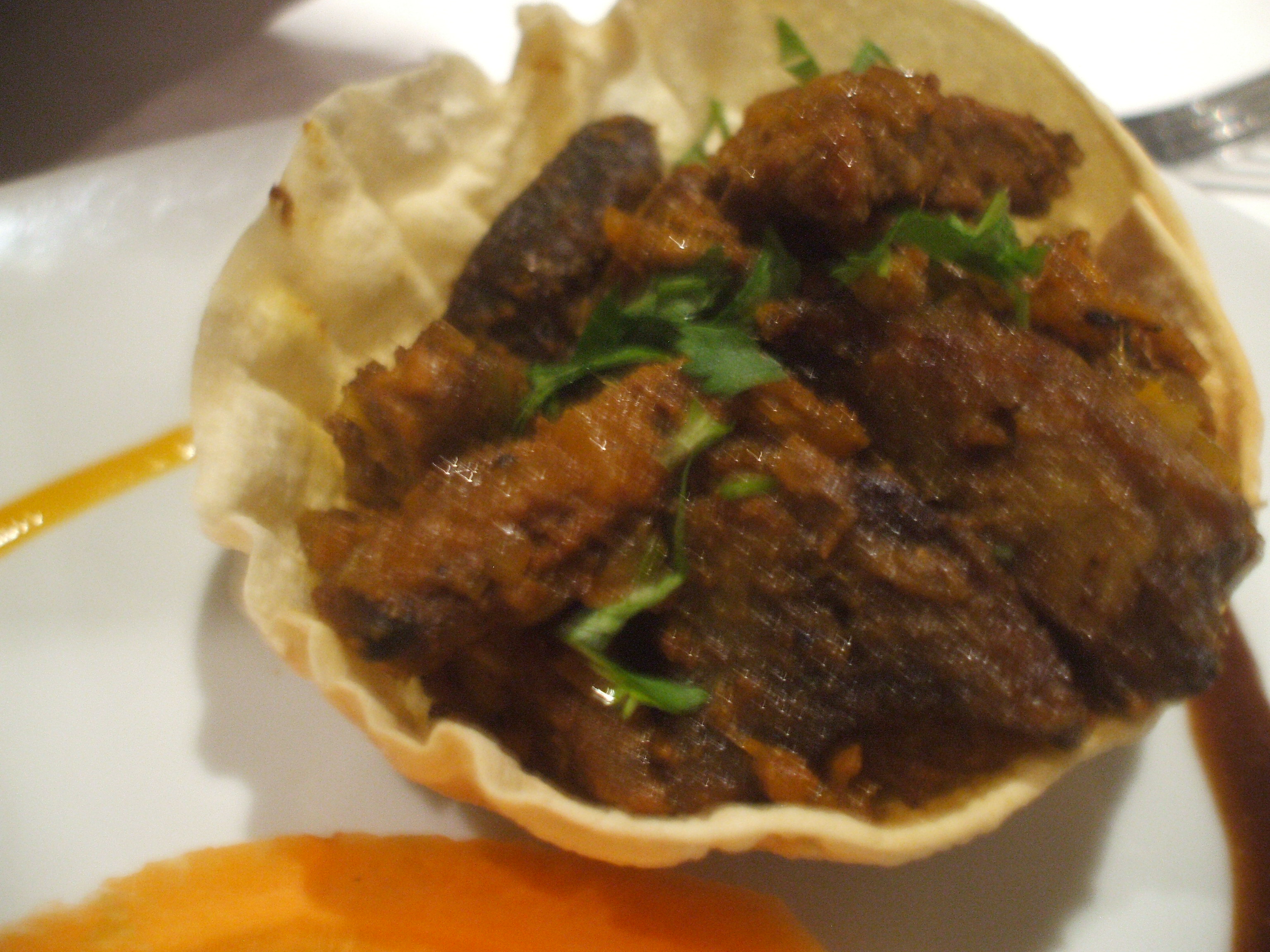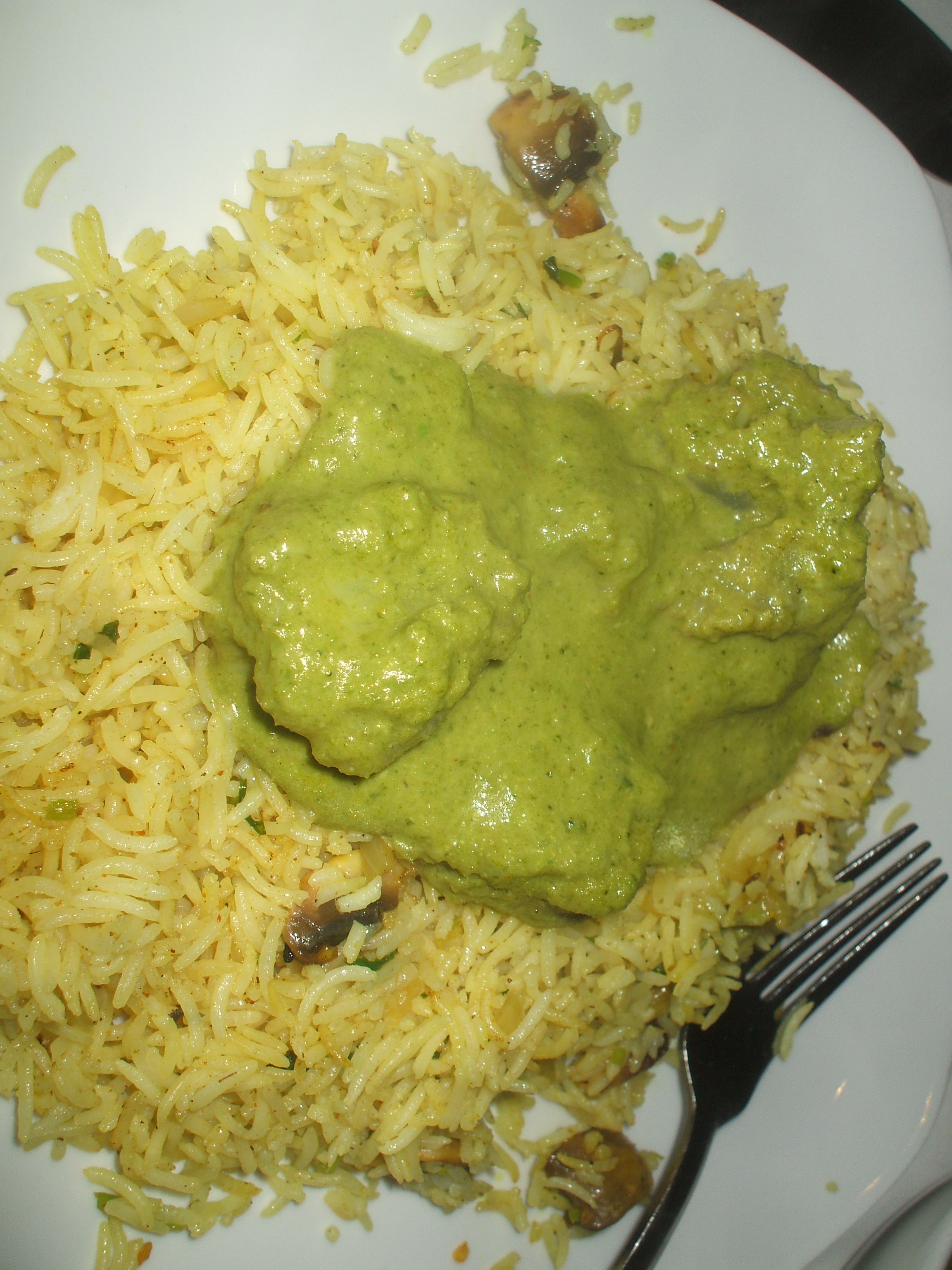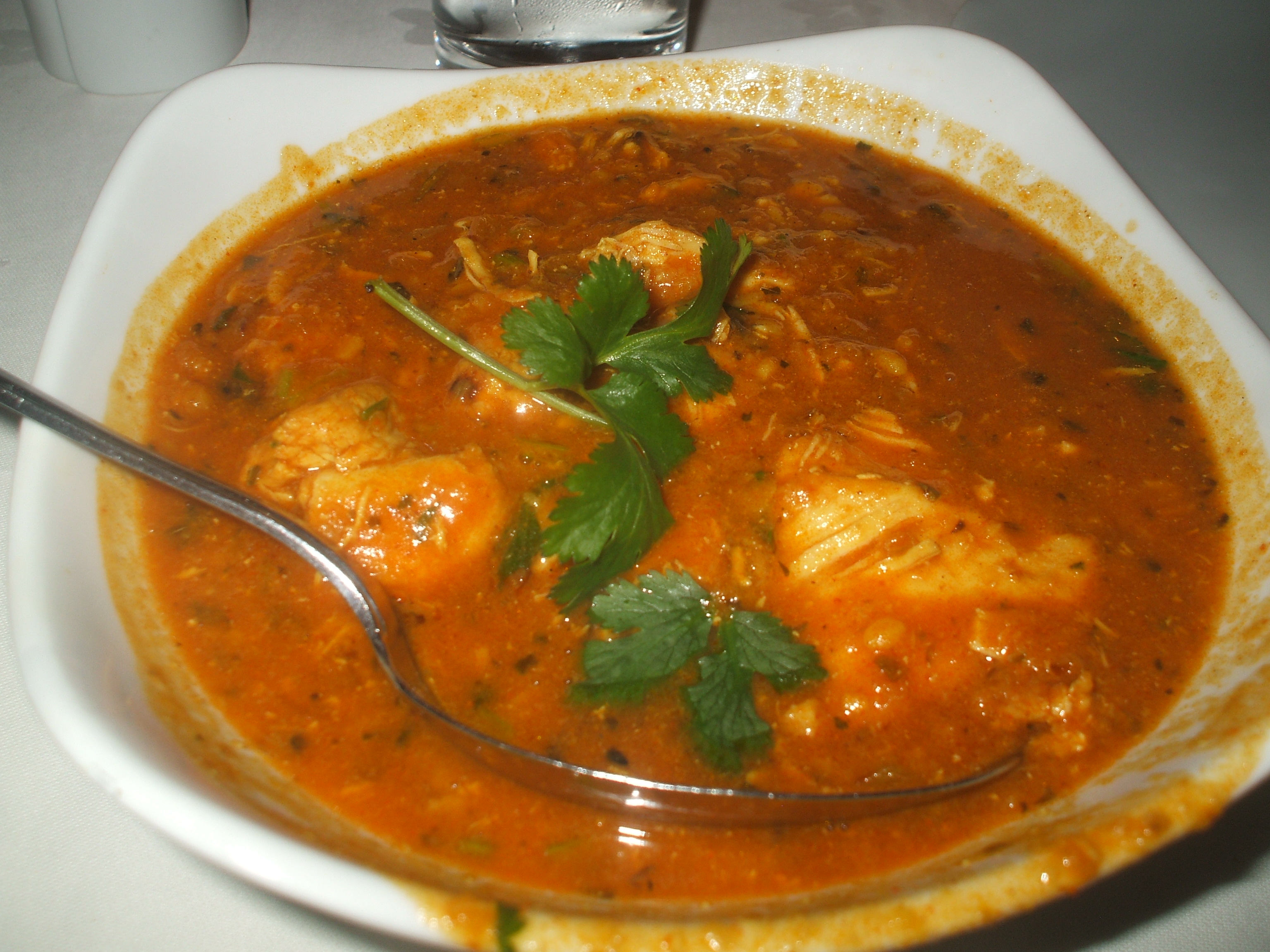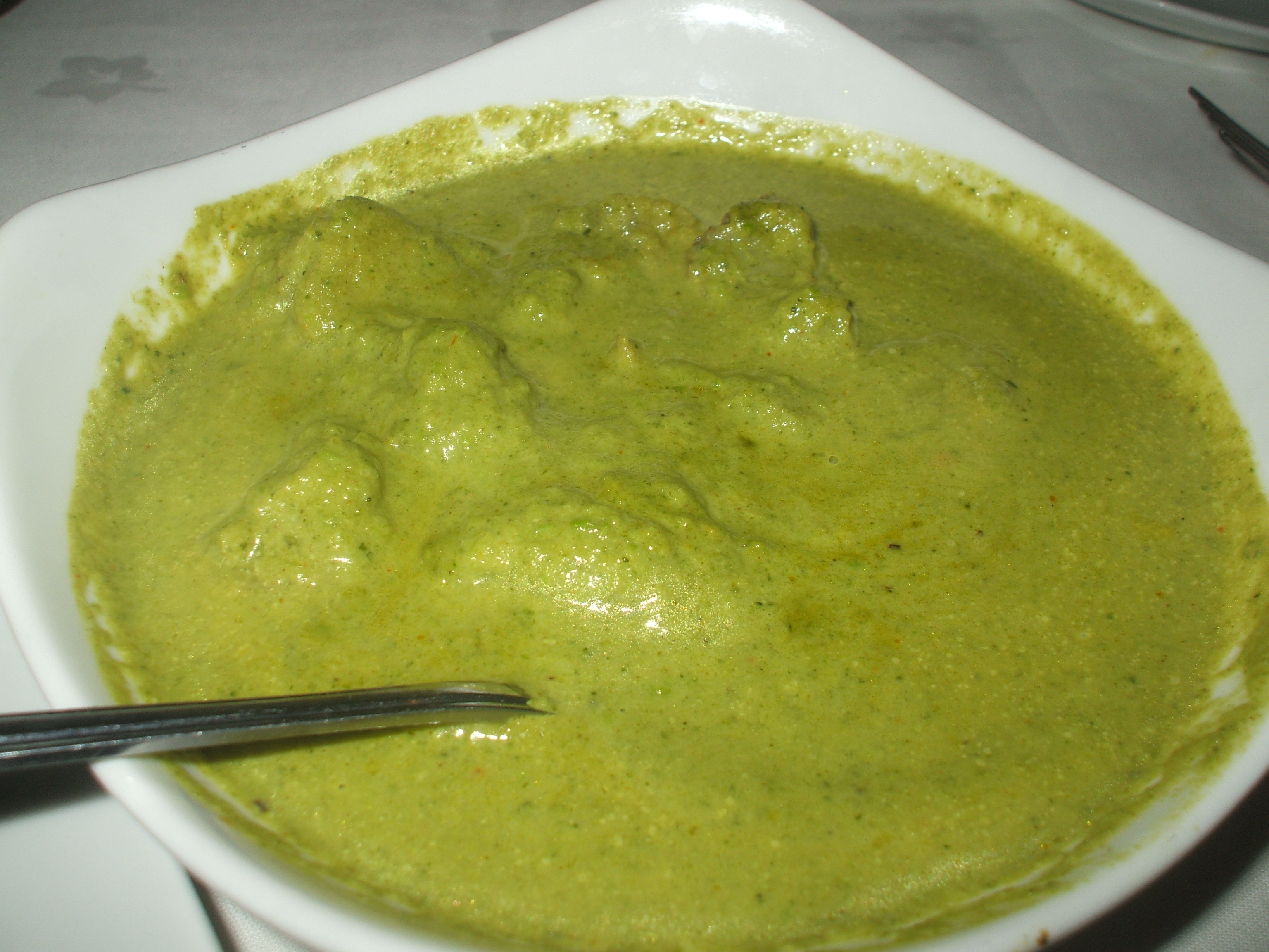Hector had ordered the Hariyo Macha. This was Monkfish in a Broccoli Sauce. I wanted something different. I needed something not too heavy. I had never eaten Monkfish before. When it arrived my heart sank: a green soup with small lumps.