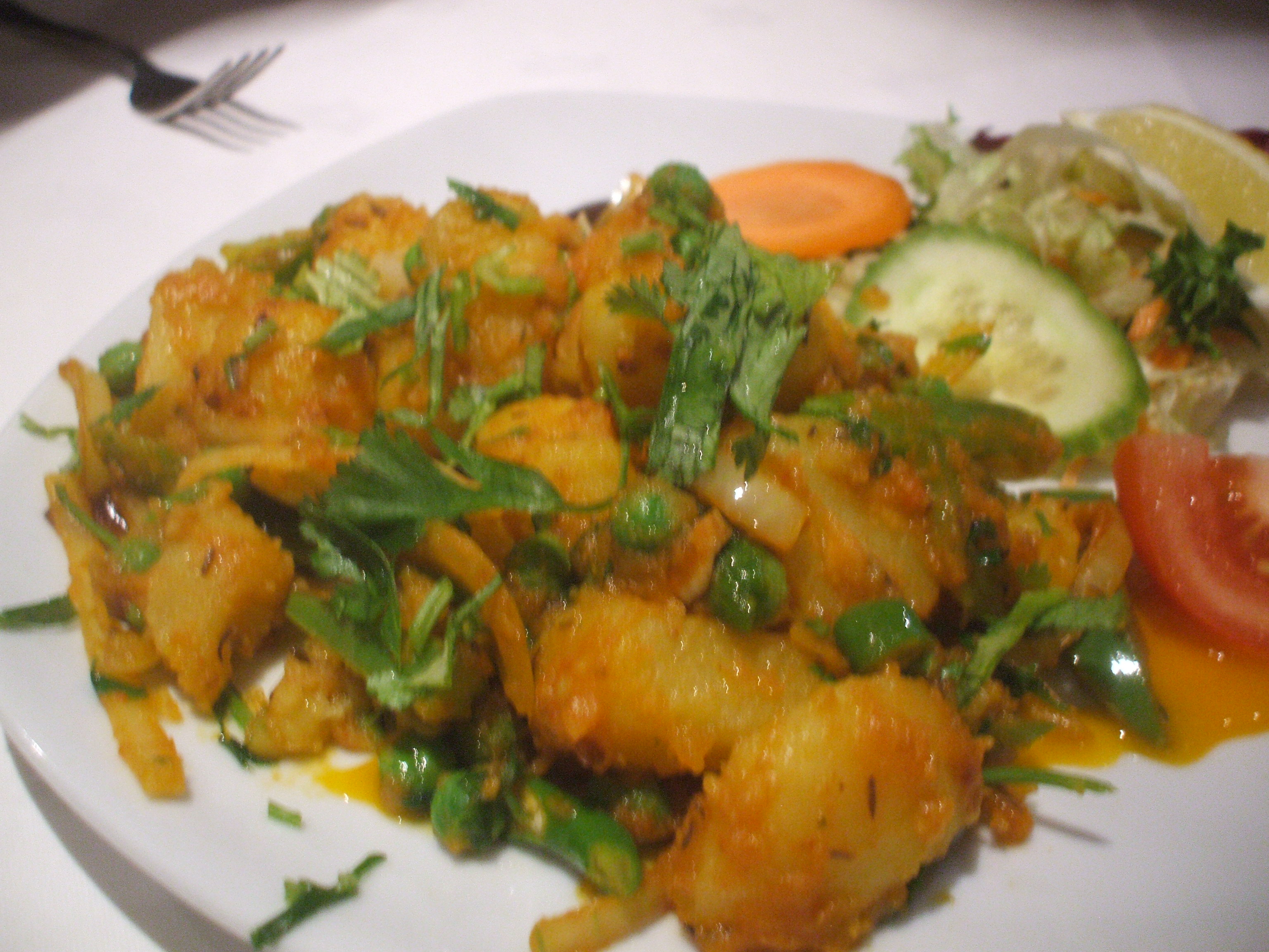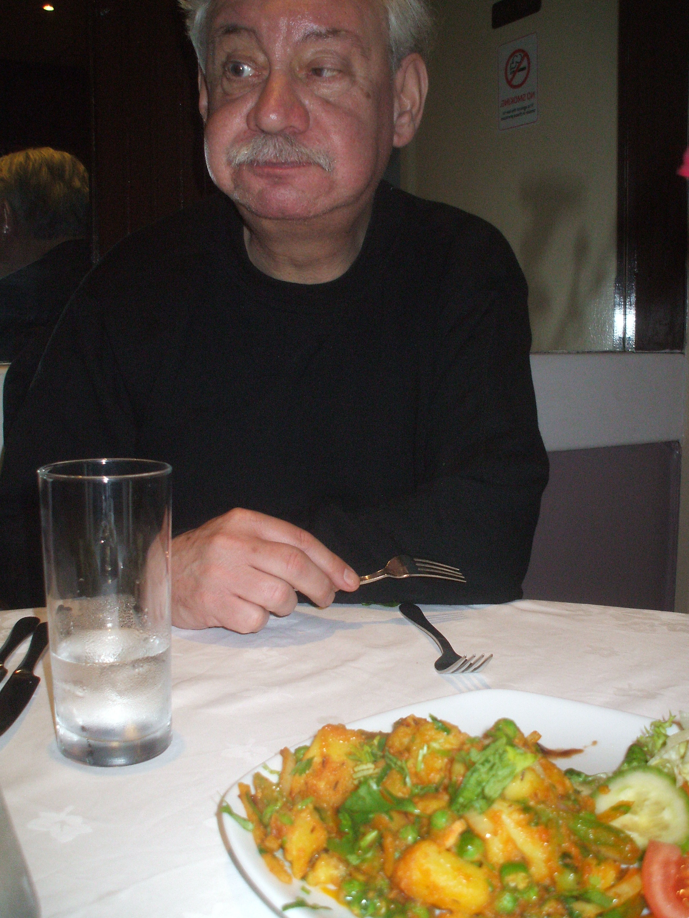 All the Dishes were under cover in heated trays, the chap spooned a fairly generous helping on to the plate. A Chapatti is what Hector had in mind as the accompaniment. The chap offered me two, two it was. I sat down, my Curry was brought to me at the table with a bottle of Sparkling Water and a glass. No cutlery, fine, but no napkin, not so fine. Four other diners kept me company. A tall elegant gentleman resplendent in earphones which he wore throughout his visit was obviously a regular. Another chap just sat and ate. A couple ate voraciously and ordered more as a takeaway (for – Doris) which they were evidently going to collect later. My Chapattis arrived and the young waiter brought me cutlery wrapped in a napkin, great. I resolved not to use the cutlery. This was Hector – blending in, just another one of the locals.