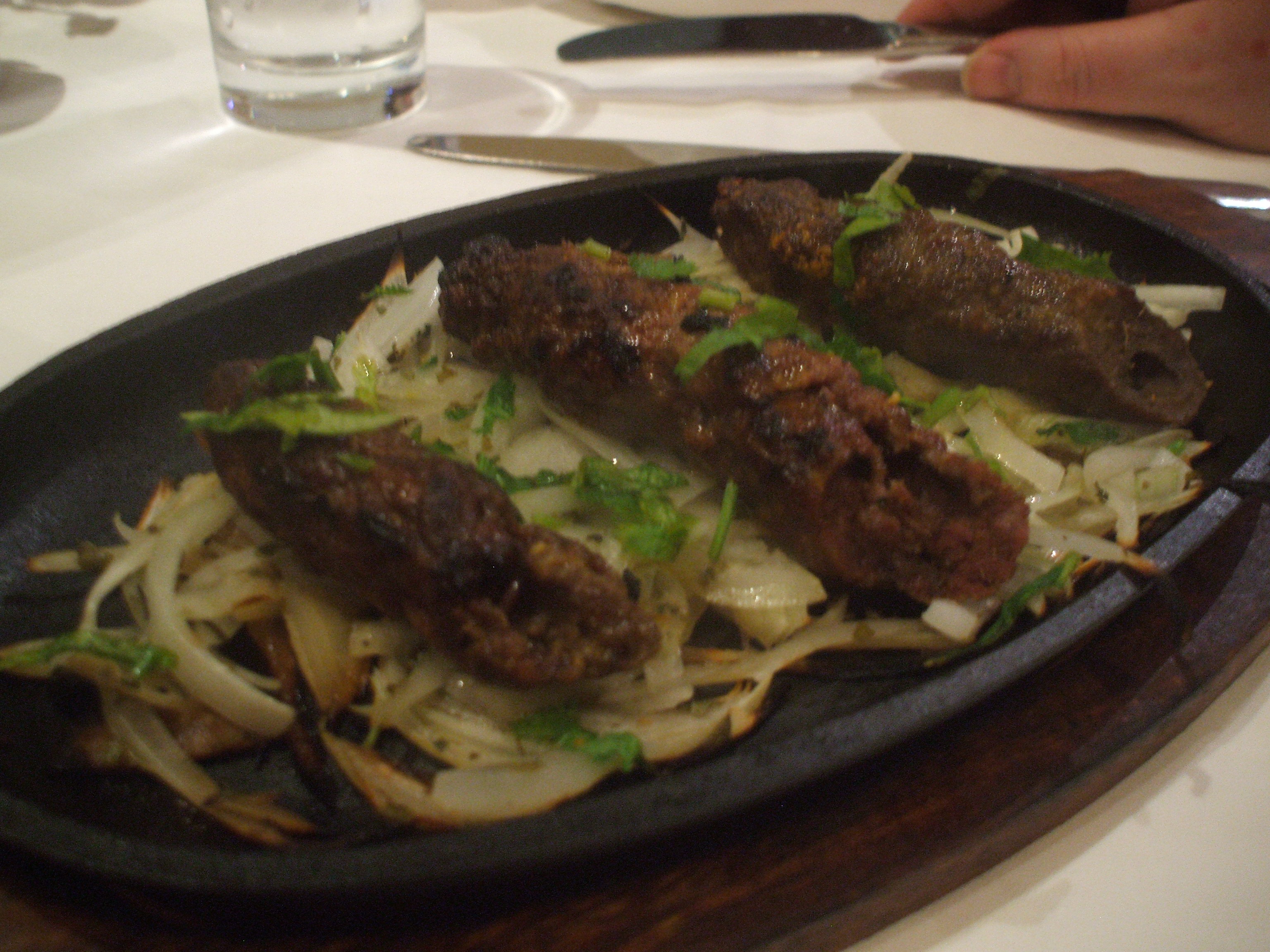 There was an order for Mo Mo which I am assured was Mince Lamb Dumplings. We shall never know because after an age three plates of Starters were brought: a Mixed Vegetable Platter, a bowl of Spicy (Tandoori?) Beef strips and what looked like a Seekh Kebab. There was no Mo Mo. There was also an apology for the late arrival and a declaration that the Starters would be free. As I had not ordered a Starter I was paying little attention. Apparently Robin had not either but he took care of most of the Vegetable Platter.