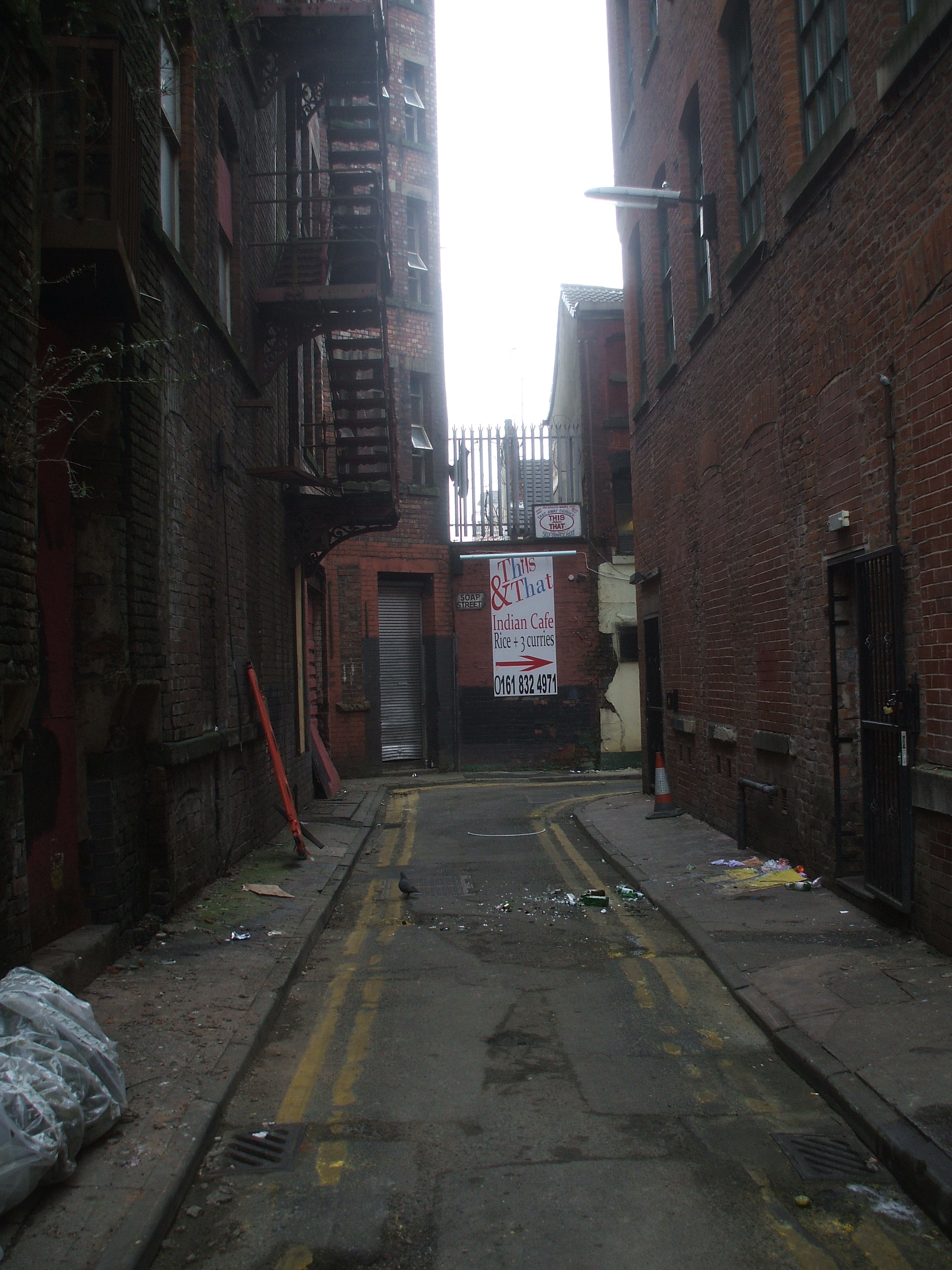 Ah, Soap St.! I could only see one end of Soap St., it became a narrow lane within 20 metres of its start, where does it go? Like a scene from a very bad movie I started walking into the abyss. Past the broken glass, there was a sharp turn to the right, there was a sign: This & That, success.