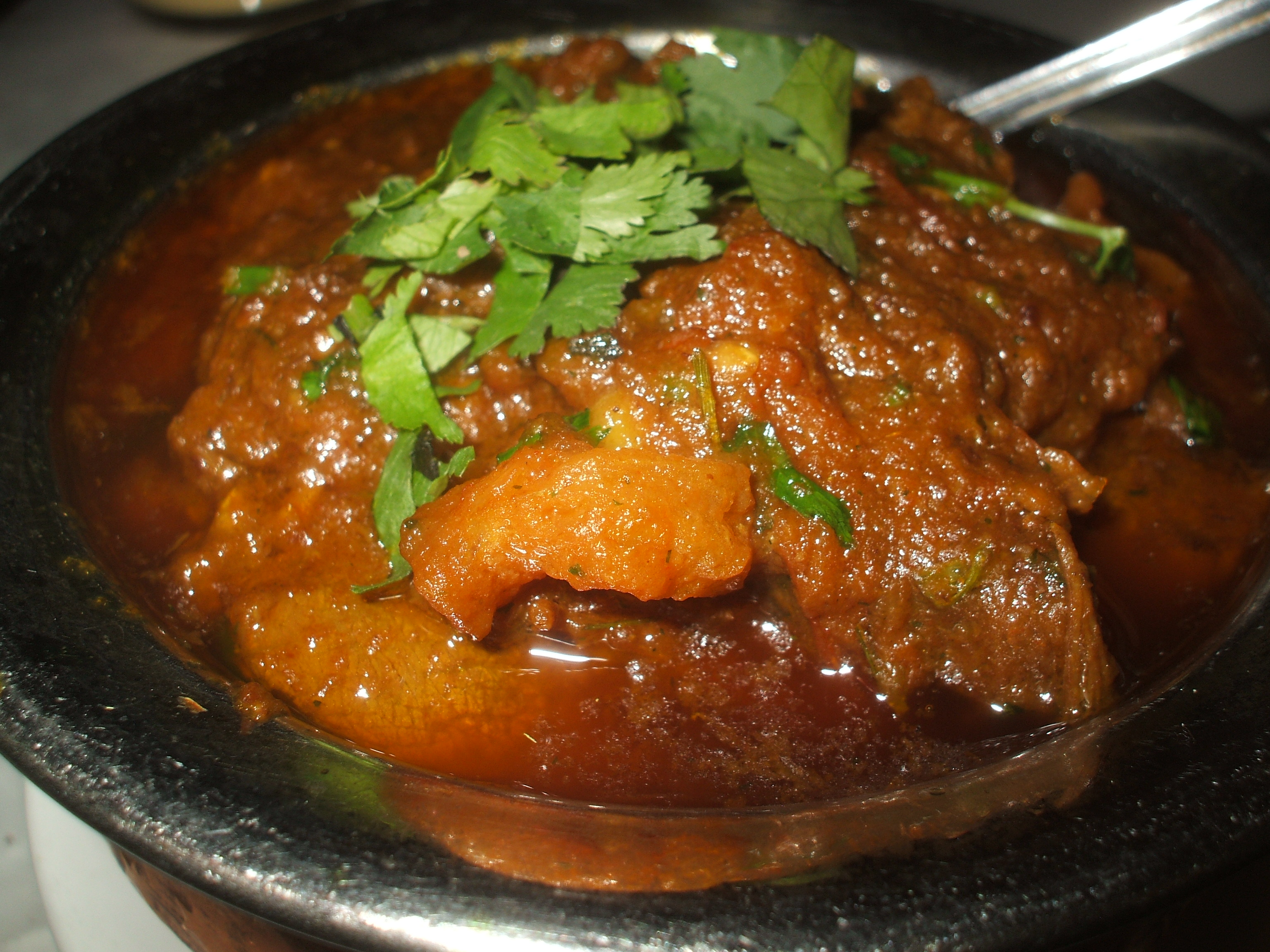 The well worn menu had – Chefs Desi Style Specialties – oh good! Hector chose the classic Karahi Gosht, Marg opted for the Karahi Fish having checked with the waiter that it would not blow her away.