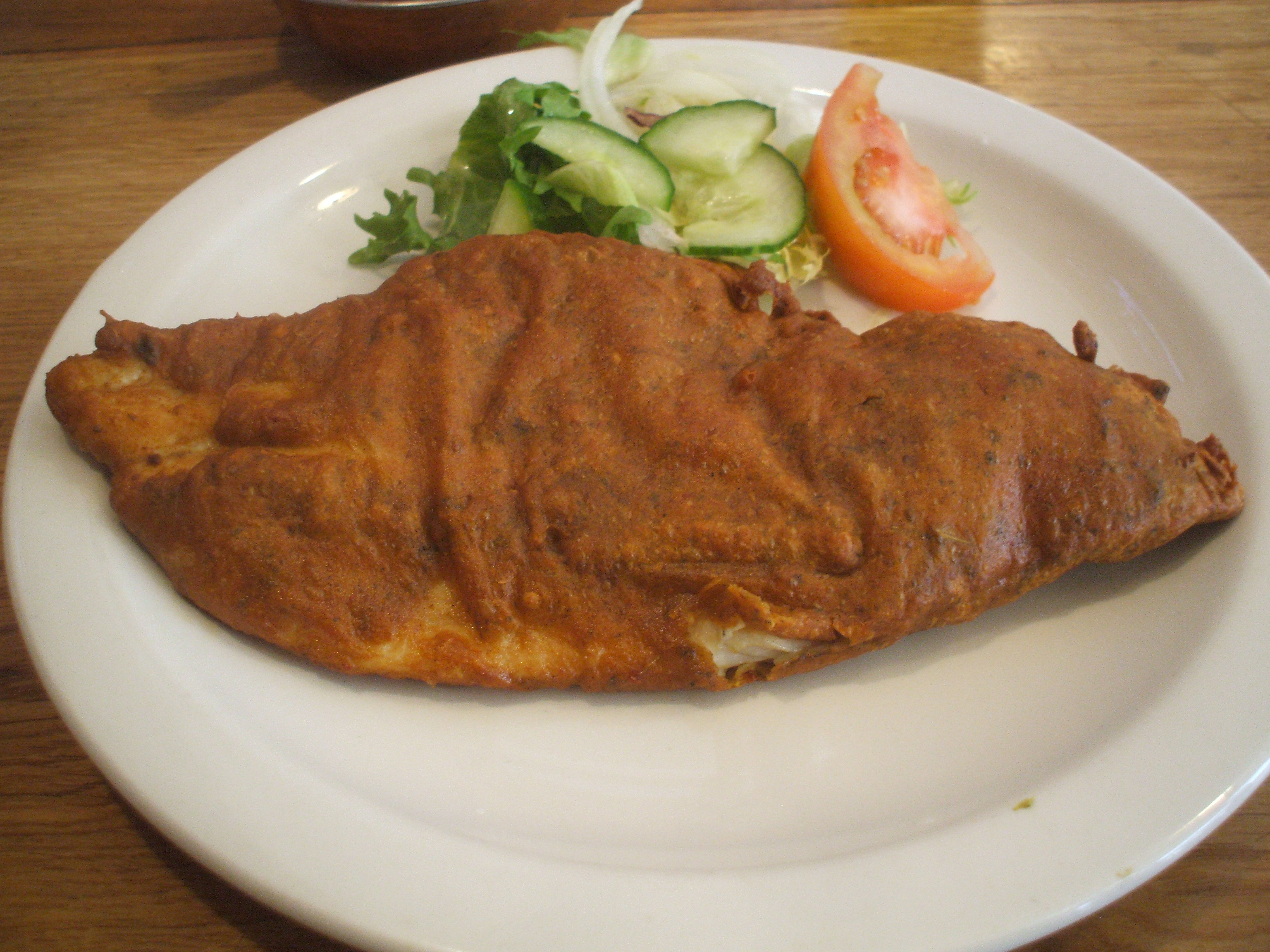 I had already decided to have the Fish. Massala Fish (marinated Salmon strips) would have to wait. The Lahori Fish (Authentic Crispy Pangasius in Lahore Spice) at £6.95 a pop had caught my eye. Pangasius? (White Catfish) There are websites stating that one should never eat this fish given the industrial pollutants along the Mekong River and stories of the farmed versions being fed other fish… One wonders where this was sourced from. I thought it was Haddock. It was served sealed in a batter to keep in the Spices that had been expertly prepared and incorporated into this aquatic vertebrate. The accompanying Dips provided a necessary source of moisture just to give the experience the edge. Spicy, tasty, I would have this again. One could imagine this being served in a local Chippy, not.