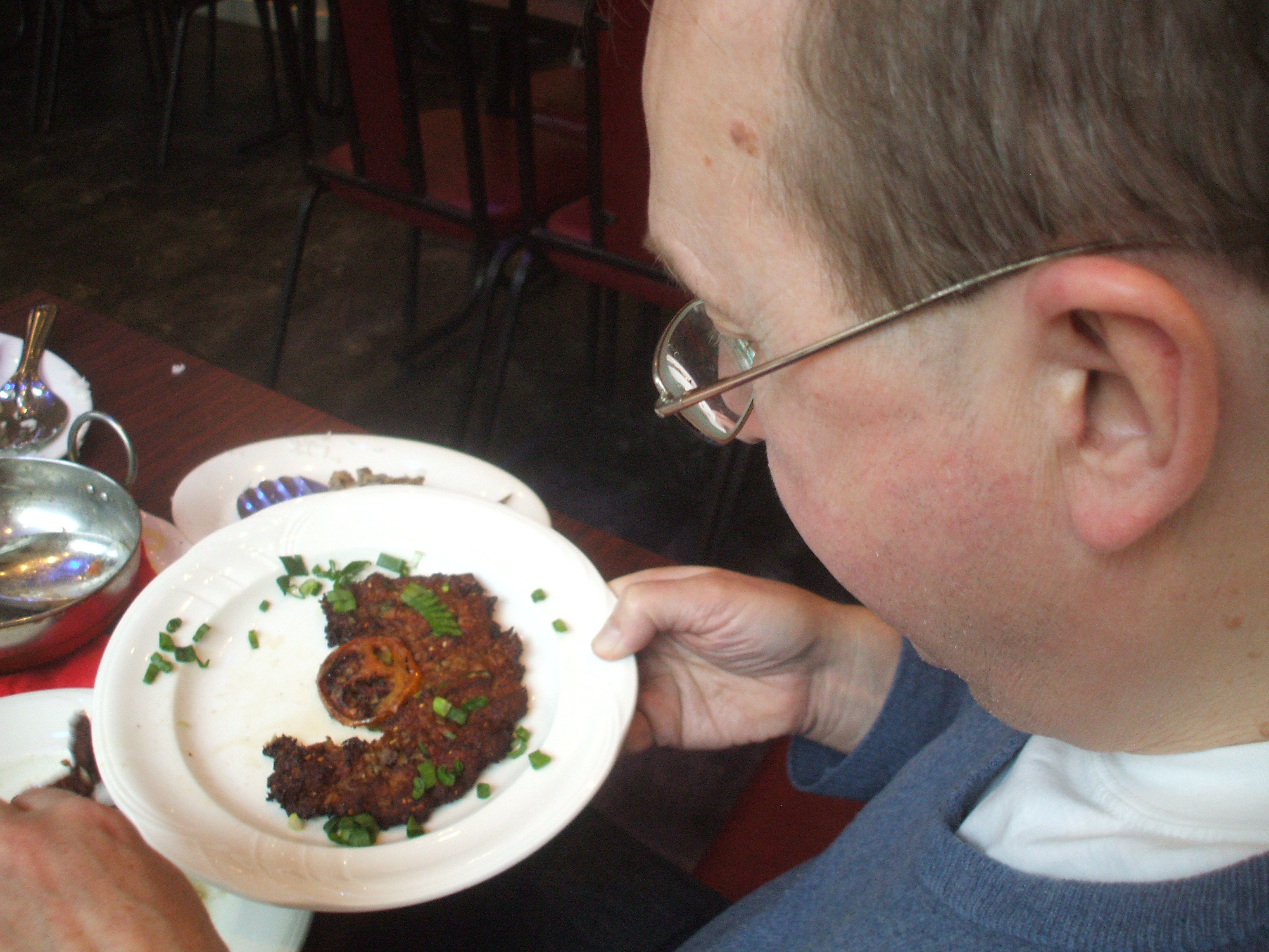 The Chapli Kebab? Instead of Chicken a red meat had been used. This was a very tasty addition to our feast; I managed no more than a sliver. Jonathan did his best, Dr Stan ‘hoovered.’ The taste took me back to my first ever experience of Polish cooking courtesy of a primary school friend’s grandmother, Mrs Slotwinska. I recall aged six or seven being taken across the Clyde to Gorbals St where a Delicatessen was located. Garlic Sausage, Kosher Gherkins, I wonder if this predates my first Curry?