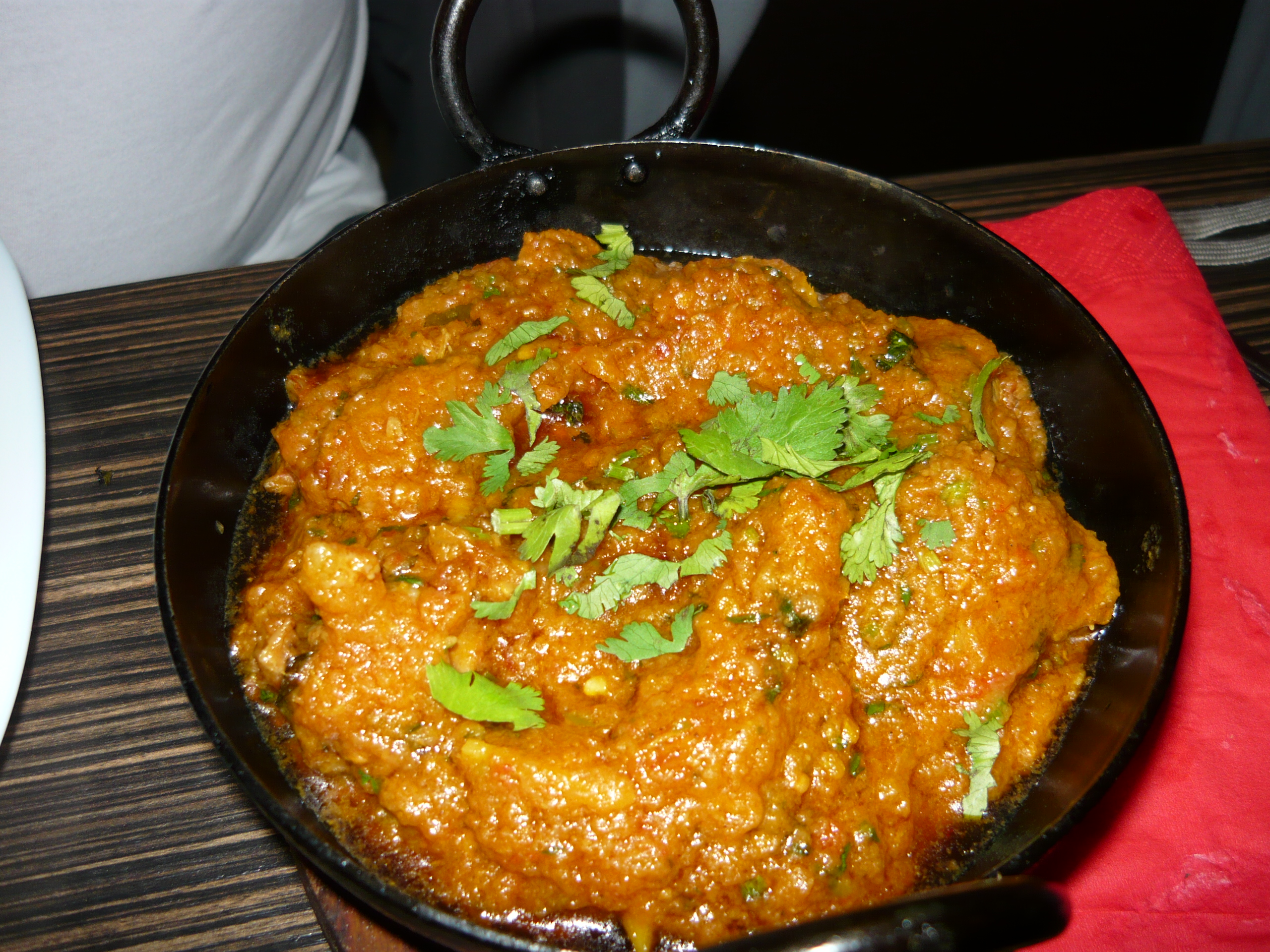 The Complementary Popadoms and Chutneys arrived in an instant and the order was given: two Lamb Lahori, Karahi one on-the bone (hot) and one off-the-bone (normal). A Vegetable Rice and the magnificent Garlic and Coriander Nan to share were our sides. Tonight there would be no ‘Dessert’.
