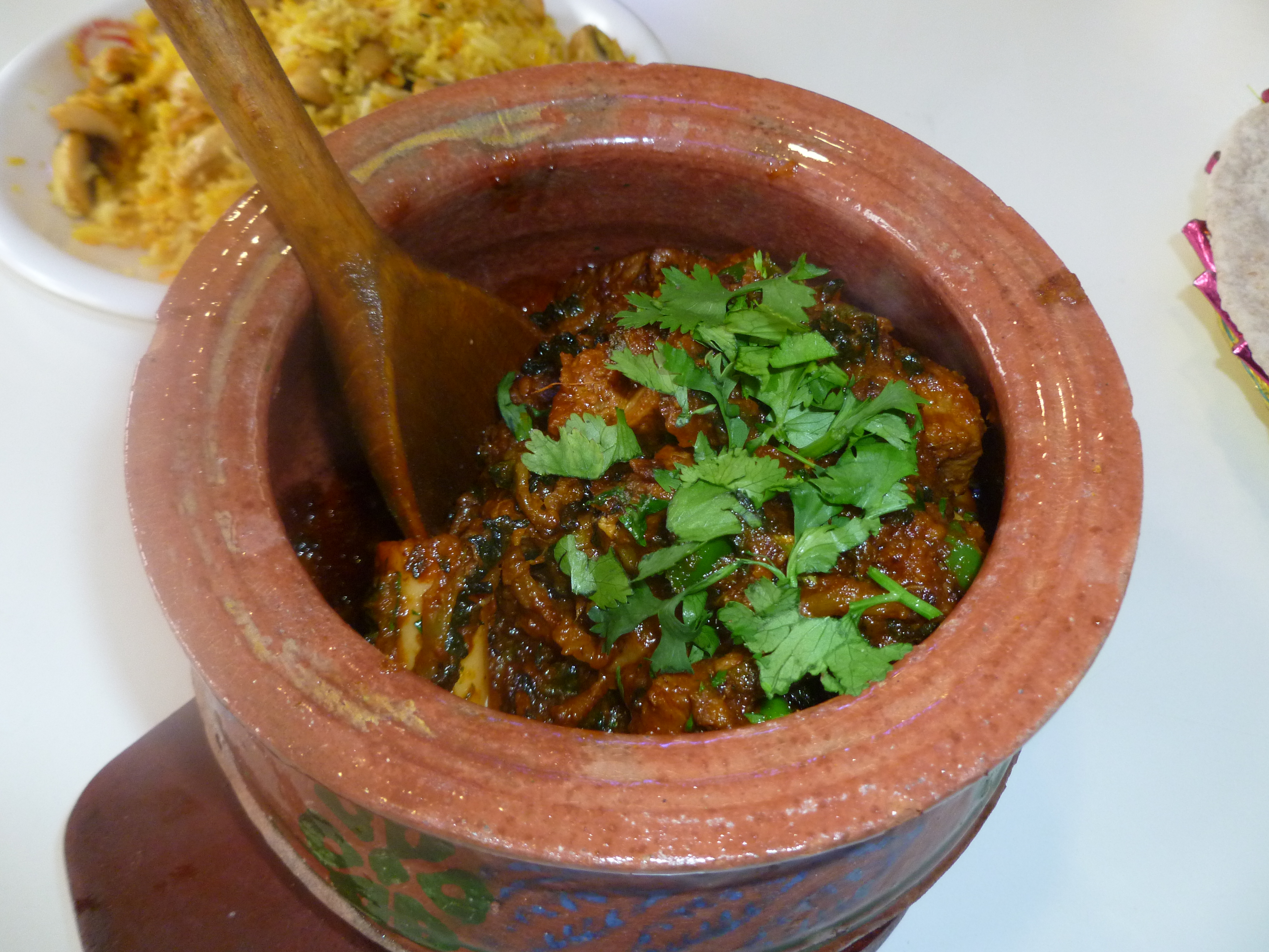 I had the keema handi. When the keema initially arrived I was disappointed because it had lots of capsicum and tomato (i like raw tomato, but not cooked) in it, but once I’d managed to remove these little offenders the dish was absolutely delicious. It looked to have been cooked in the same clay pot in which it was served, as there were a couple of areas of of burnt sauce inside the pot, which, when scraped away and stirred back into the curry gave it another tasty depth of flavour.