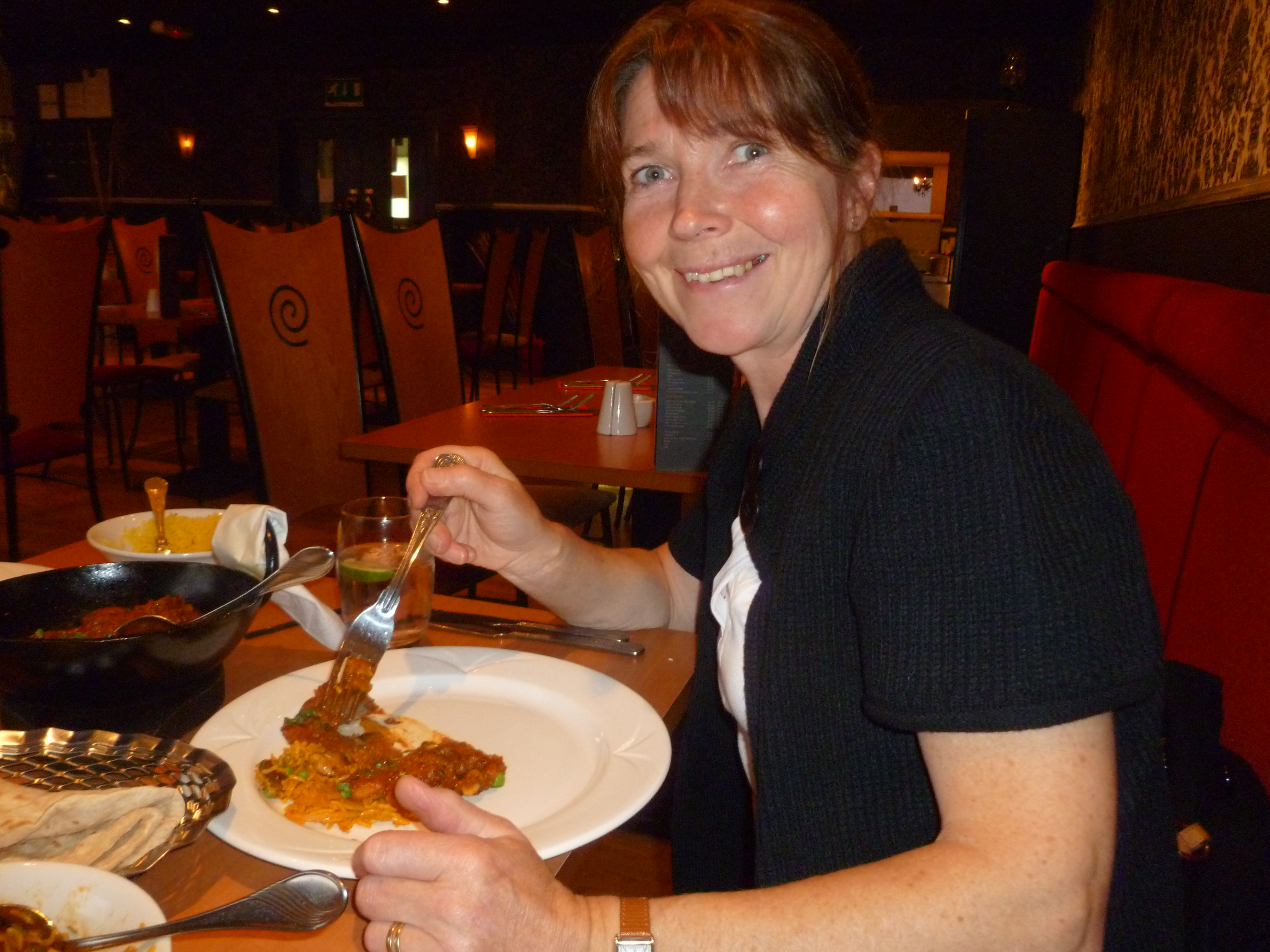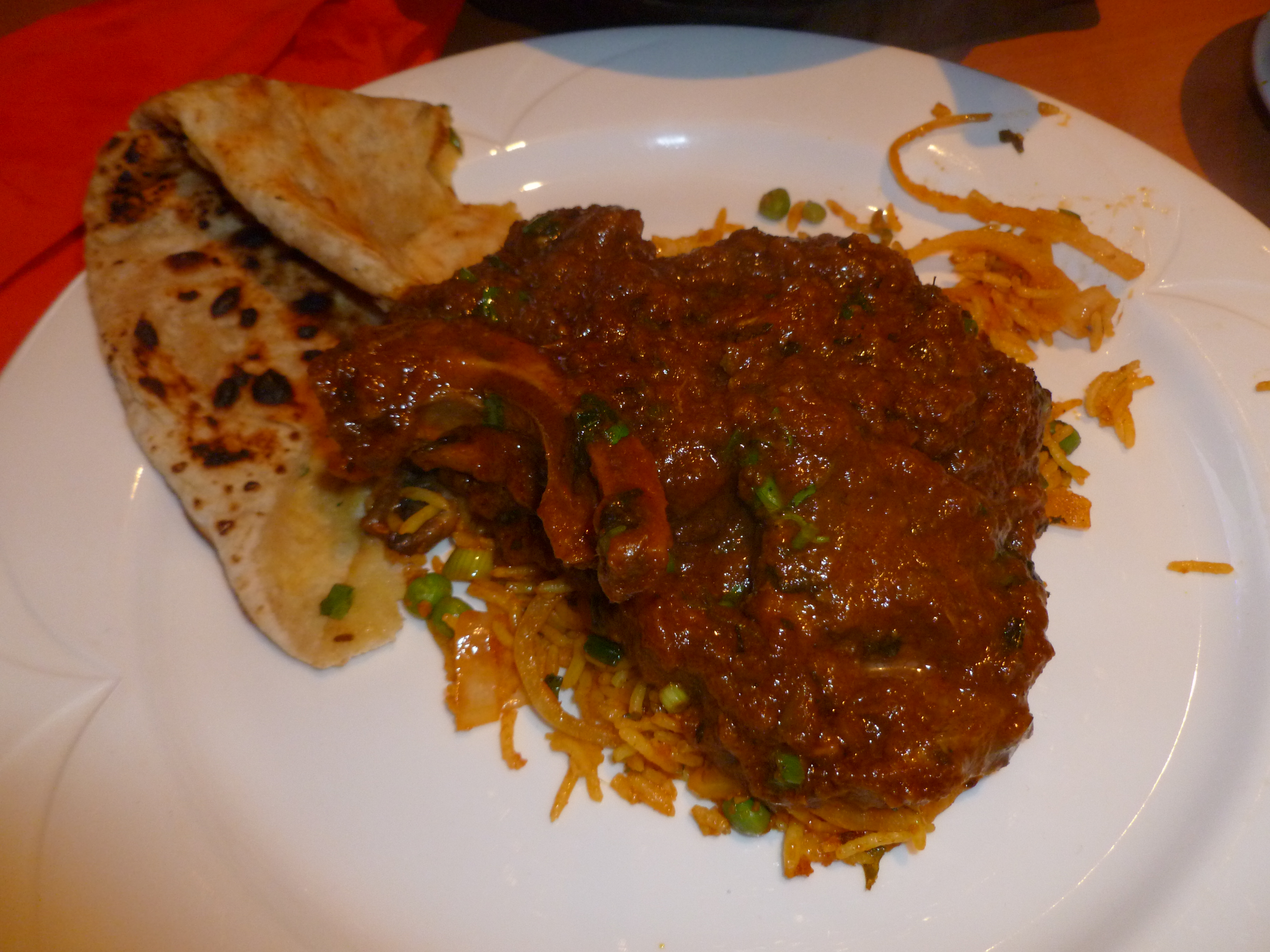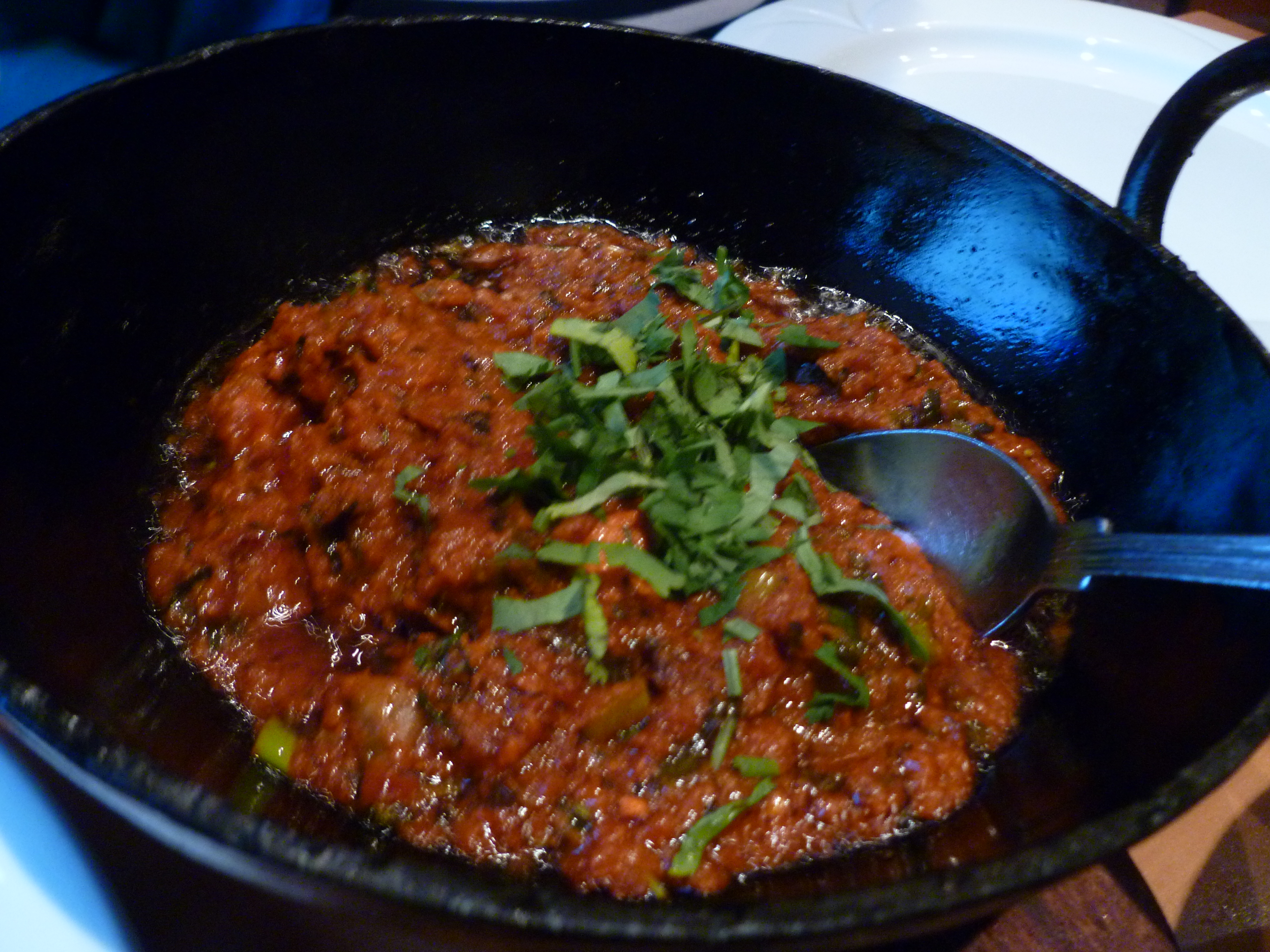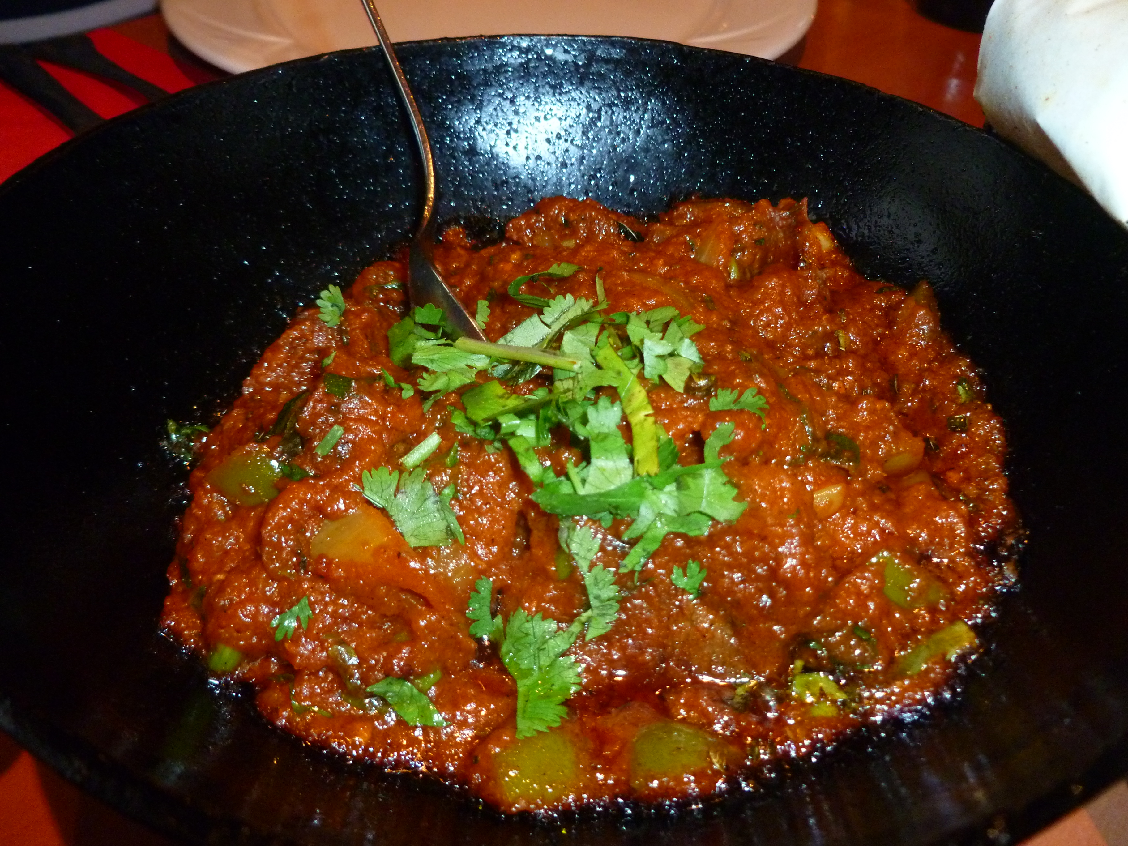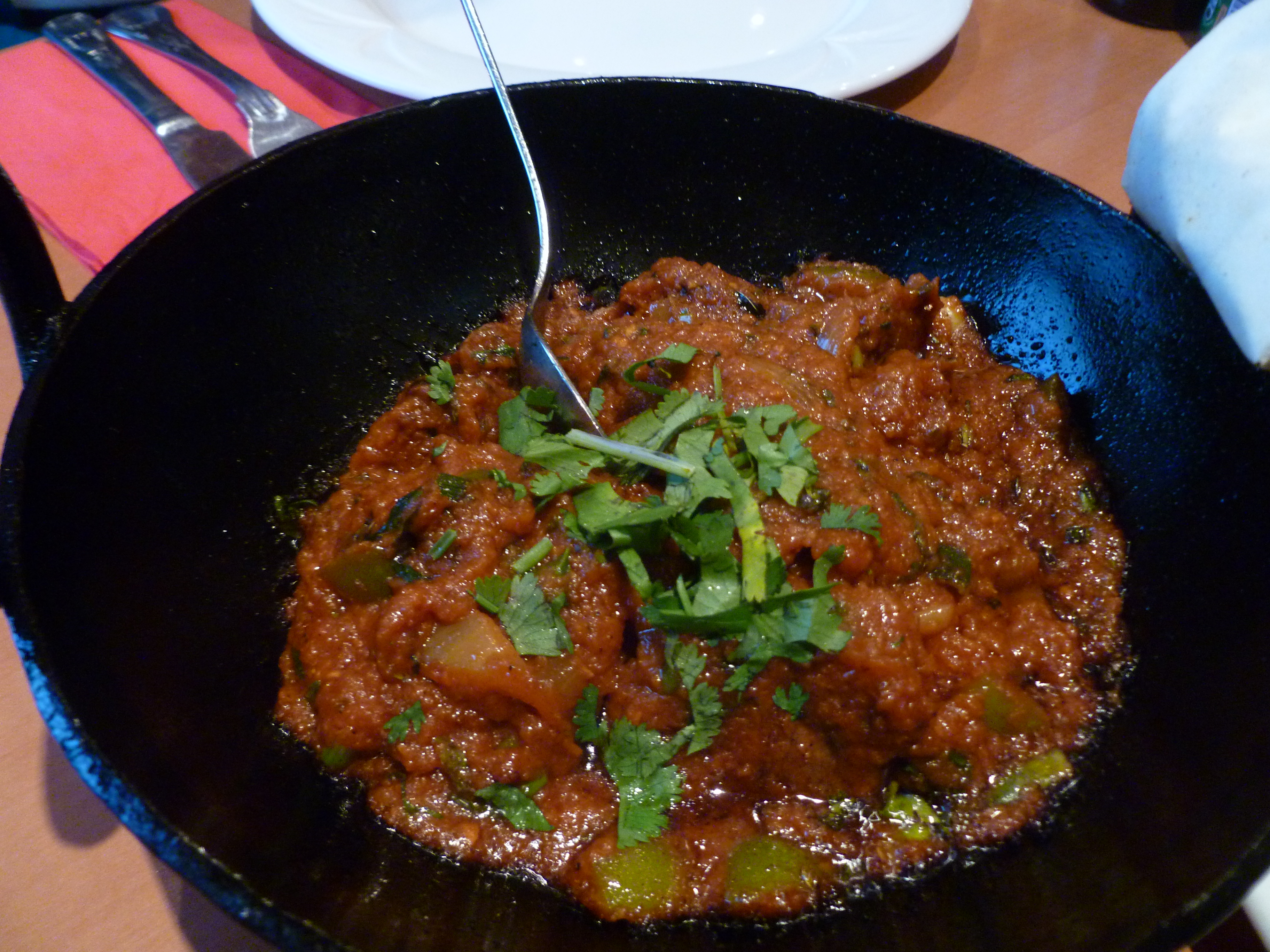 The meals were brought in large black Karahis and the contents were sizzling. This always impresses but what about the taste? I cannot say that there was anything distinctive about my Lamb dish at all. It was competently cooked but there was absolutely nothing to become excited about. The portion of Lamb Chops was ample and the meat tender. One kept hoping that a flavour of note would reveal itself, alas, not. Kirsty’s dish will forever remain a mystery; Marg always leaves me some…