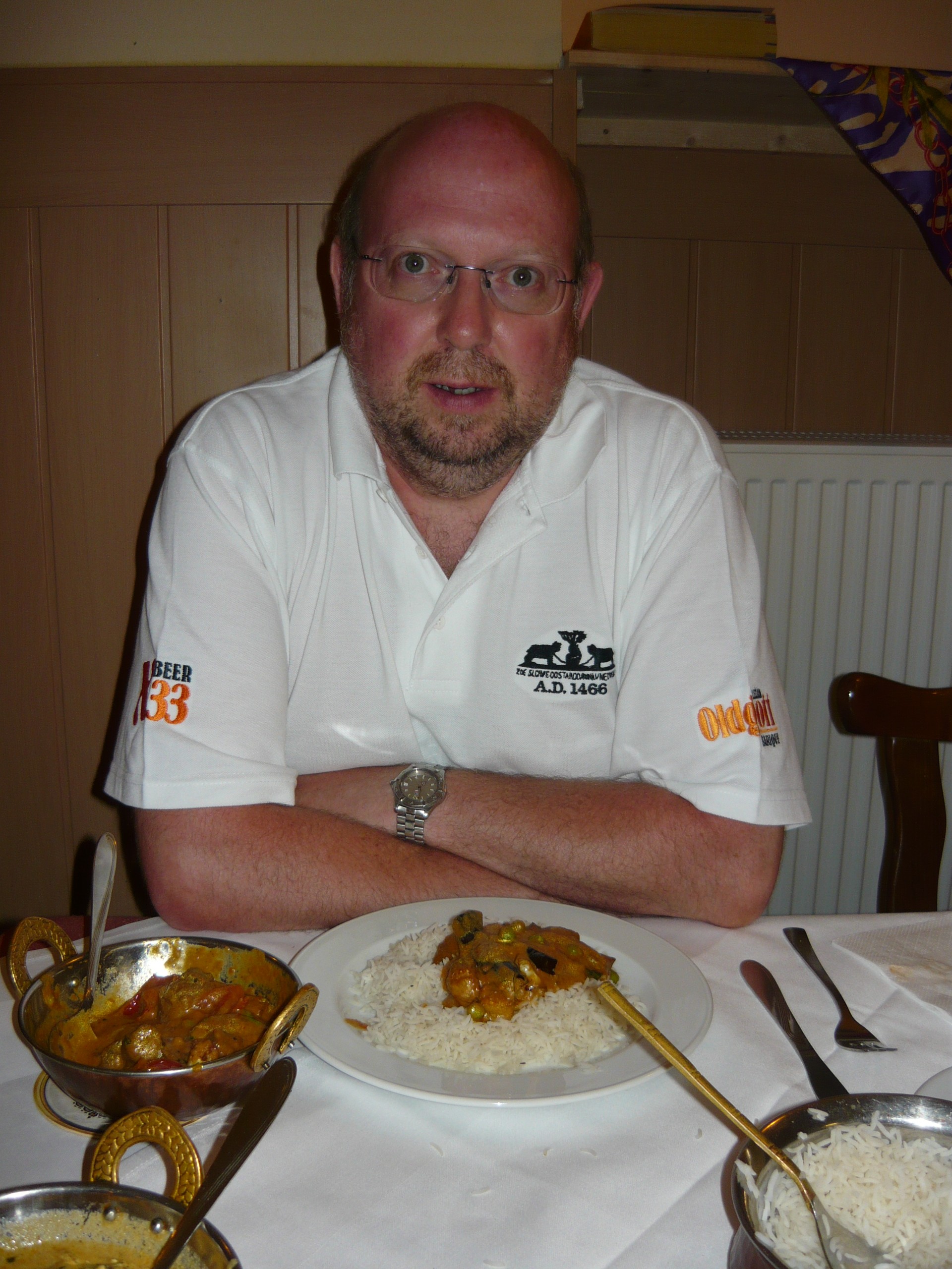 Hector recognised Marg’s Curry as that served up during up seventeen days in Sri Lanka in 1993. The Masala was creamy, thin and there was plenty of it. As ever I dipped a bit of Chapatti into my own Masala, very good was my instant judgement. The Lamb dish worked because of the array of included Vegetables: Courgette, Peas, Eggplant, Cauliflower. And add to this more Rice than two could eat, and one could tell they were out to feed us.