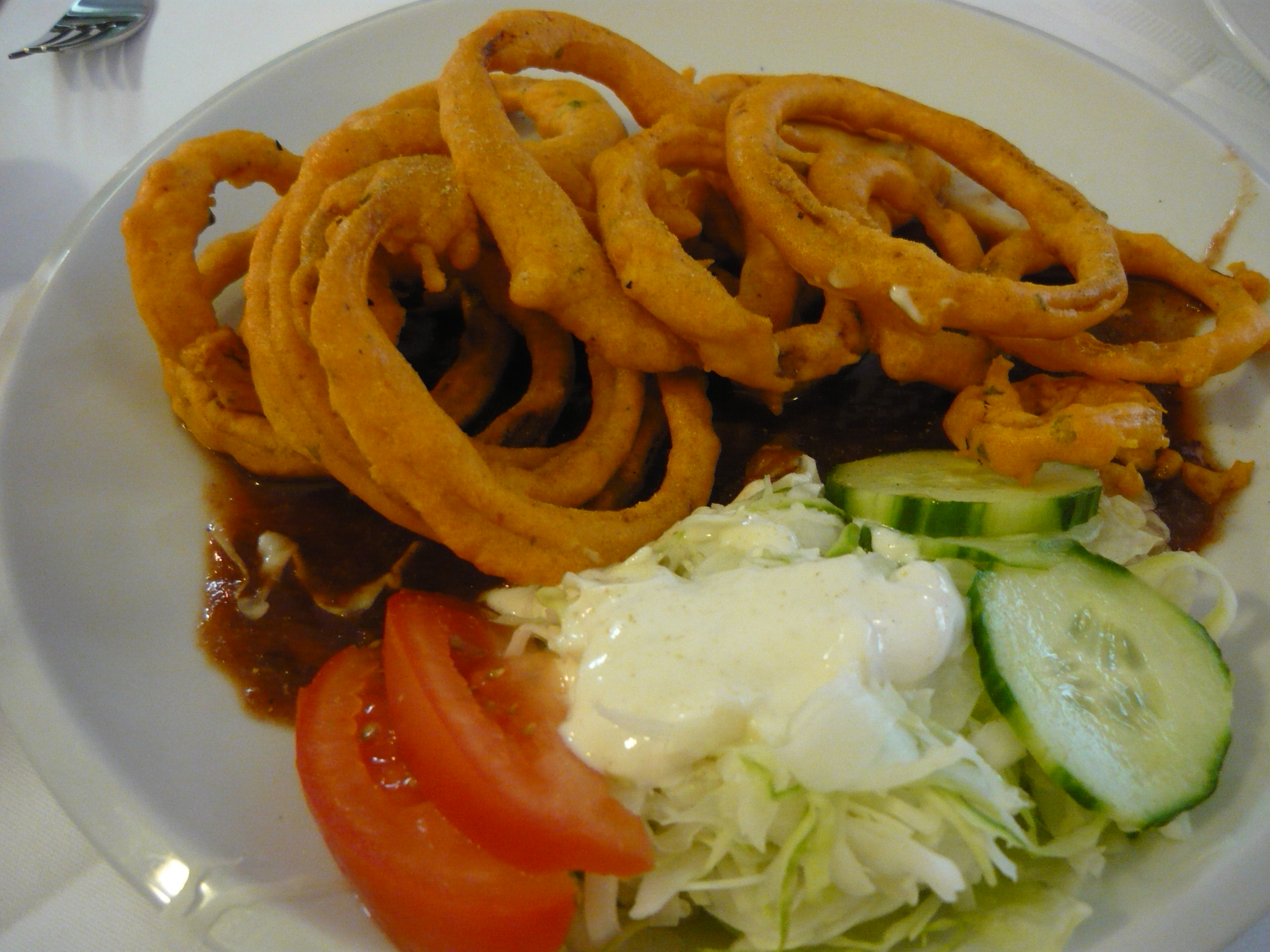 The cooking was done in an area immediately before us. The Onion Baji turned out to Onion Rings served with a small Salad and a spicy sauce. These were devoured. It had taken us much less time to eat the food than it had taken for the couple to prepare and serve it.
