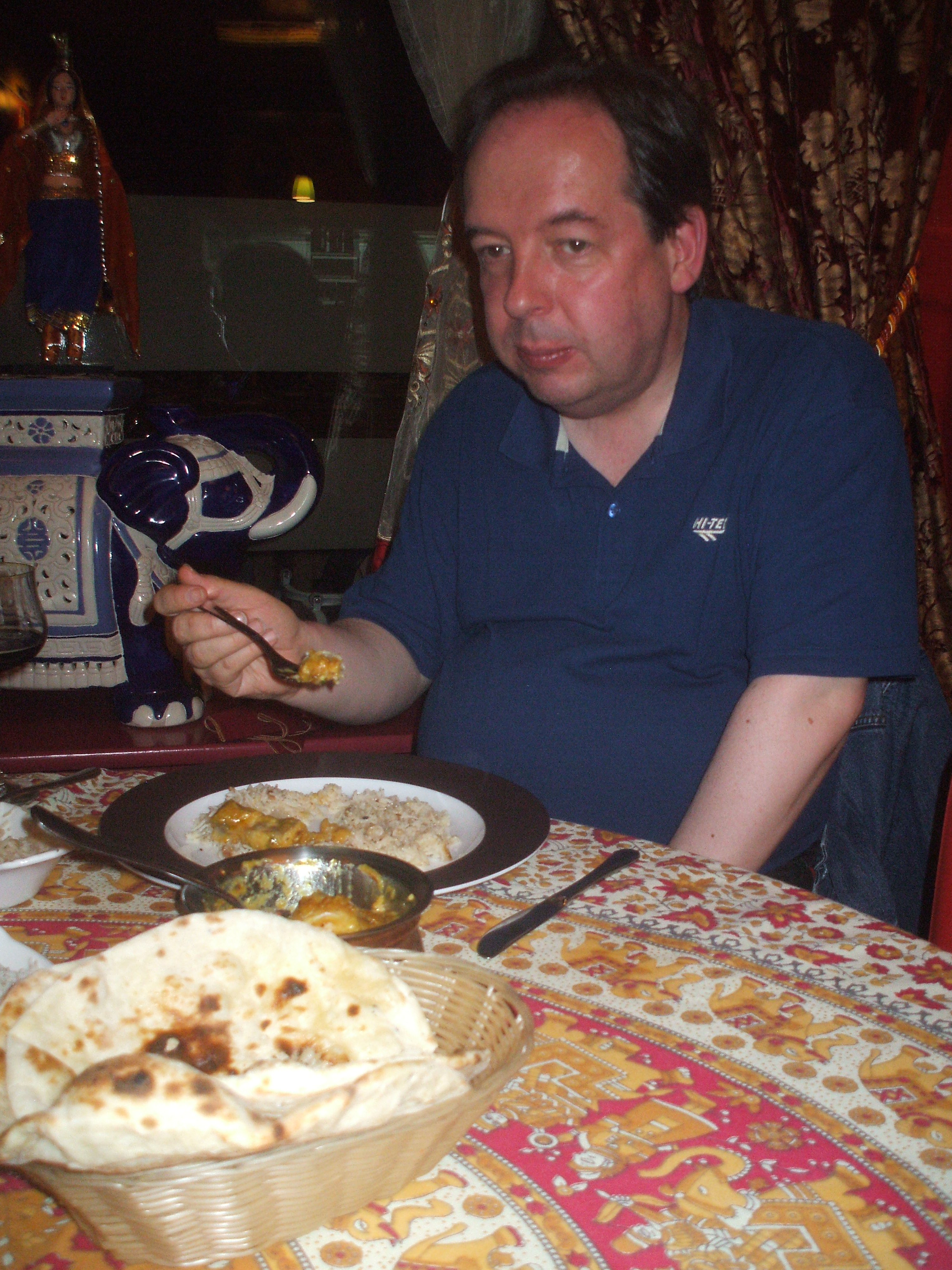 The colour was wrong, the taste was wrong: Sweet. The plain Pilau Rice and the lack of any Vegetable made this a rather uninteresting meal to eat, no diversity of texture or flavour. We had asked for it hot, a waste of time evidently. I felt the Nan was the best part of the meal, Robin thought it was the worst.