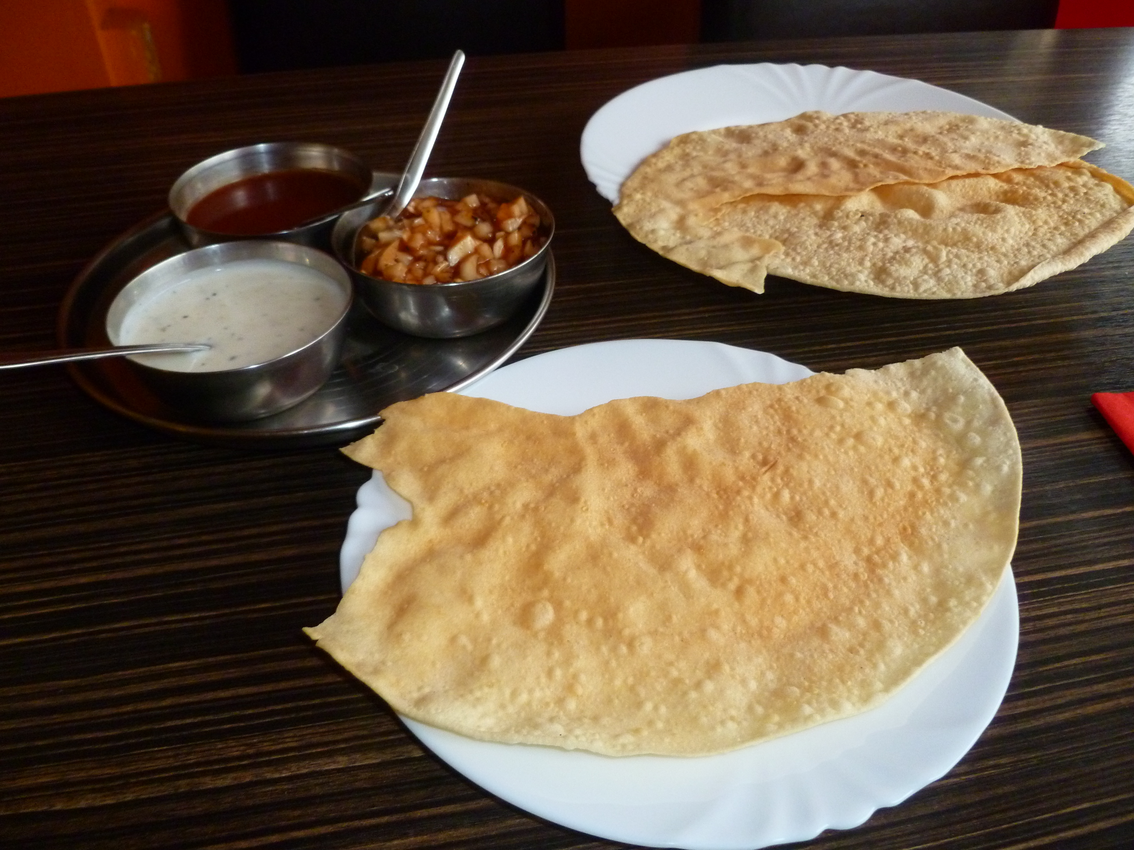 Hassan sat with me for a while to chat and the Poppadoms and Onion Chutney were brought over. Two Poppadoms, on the house.