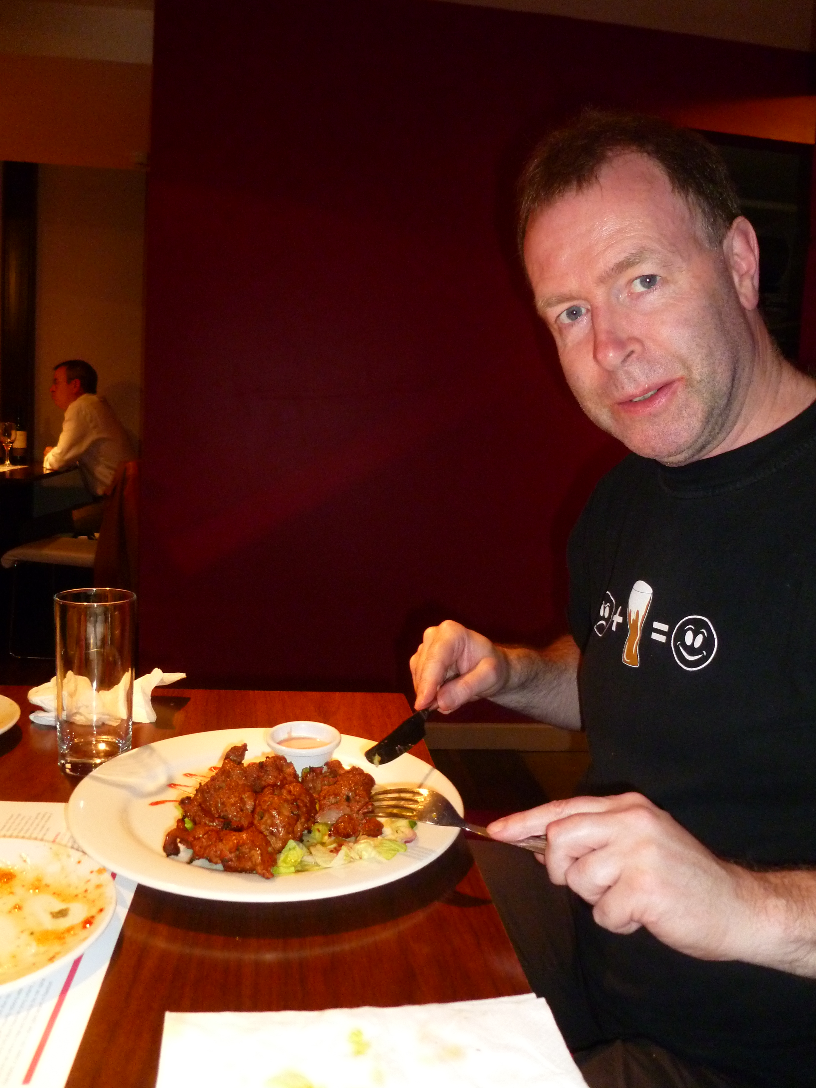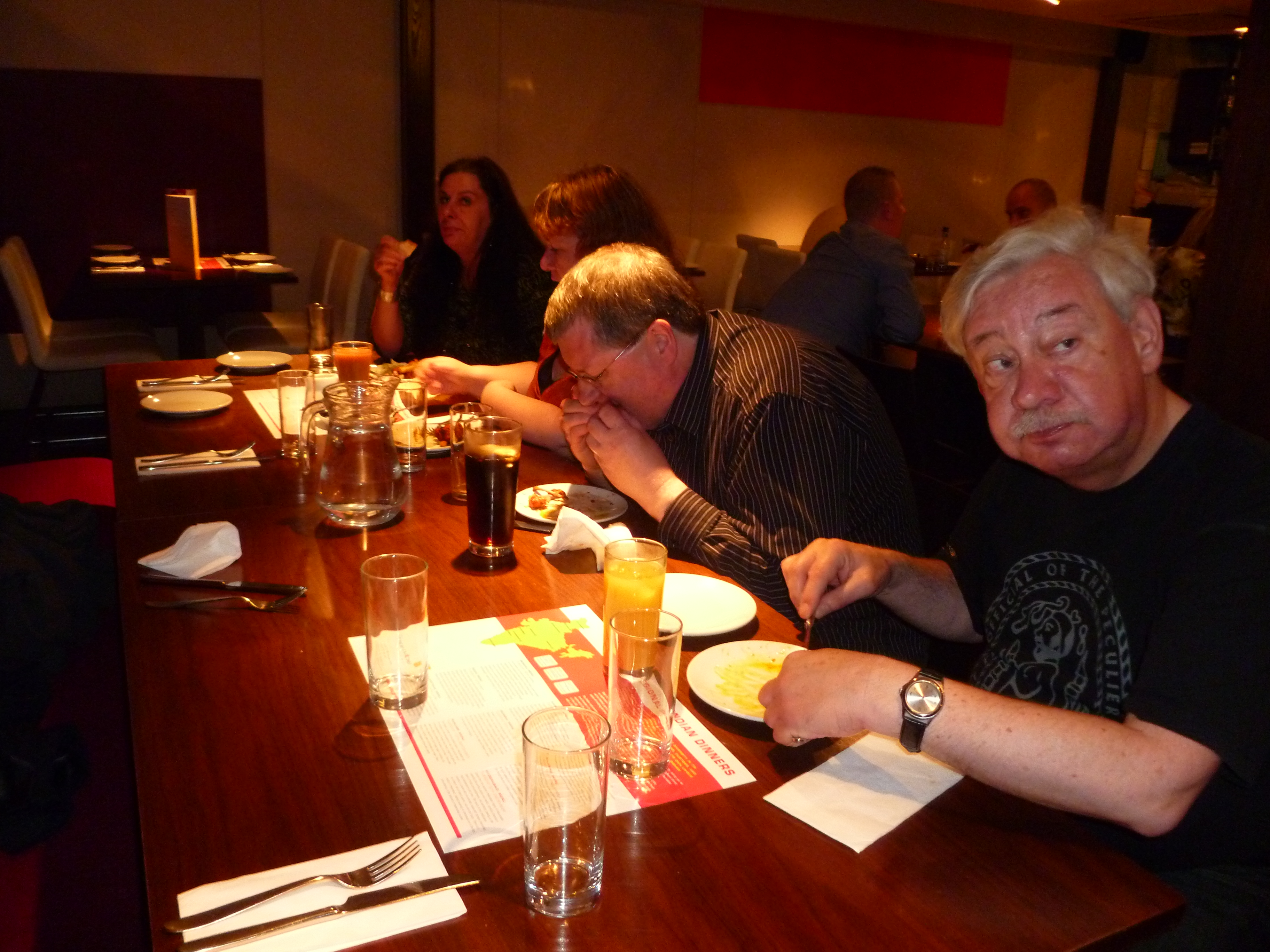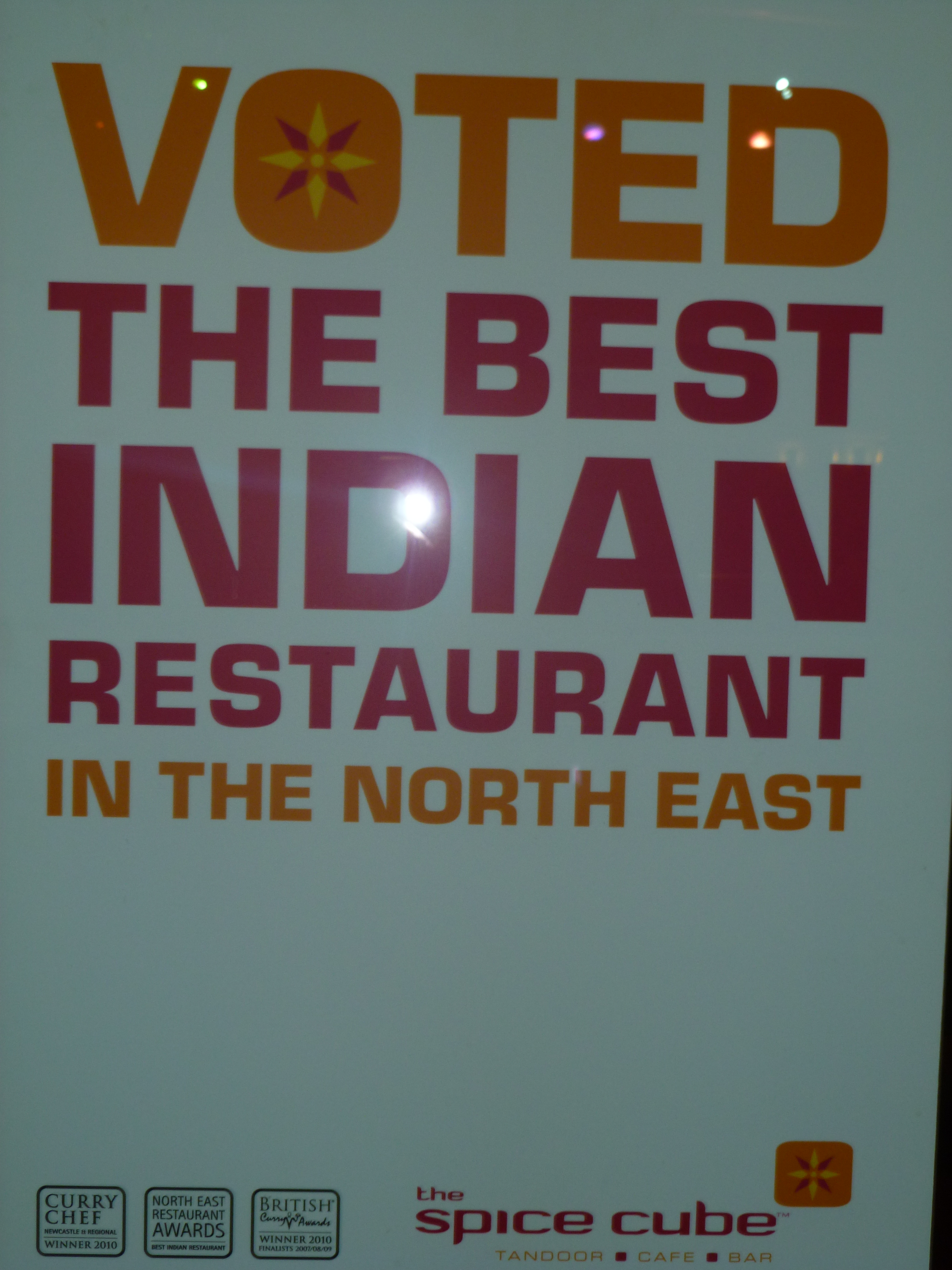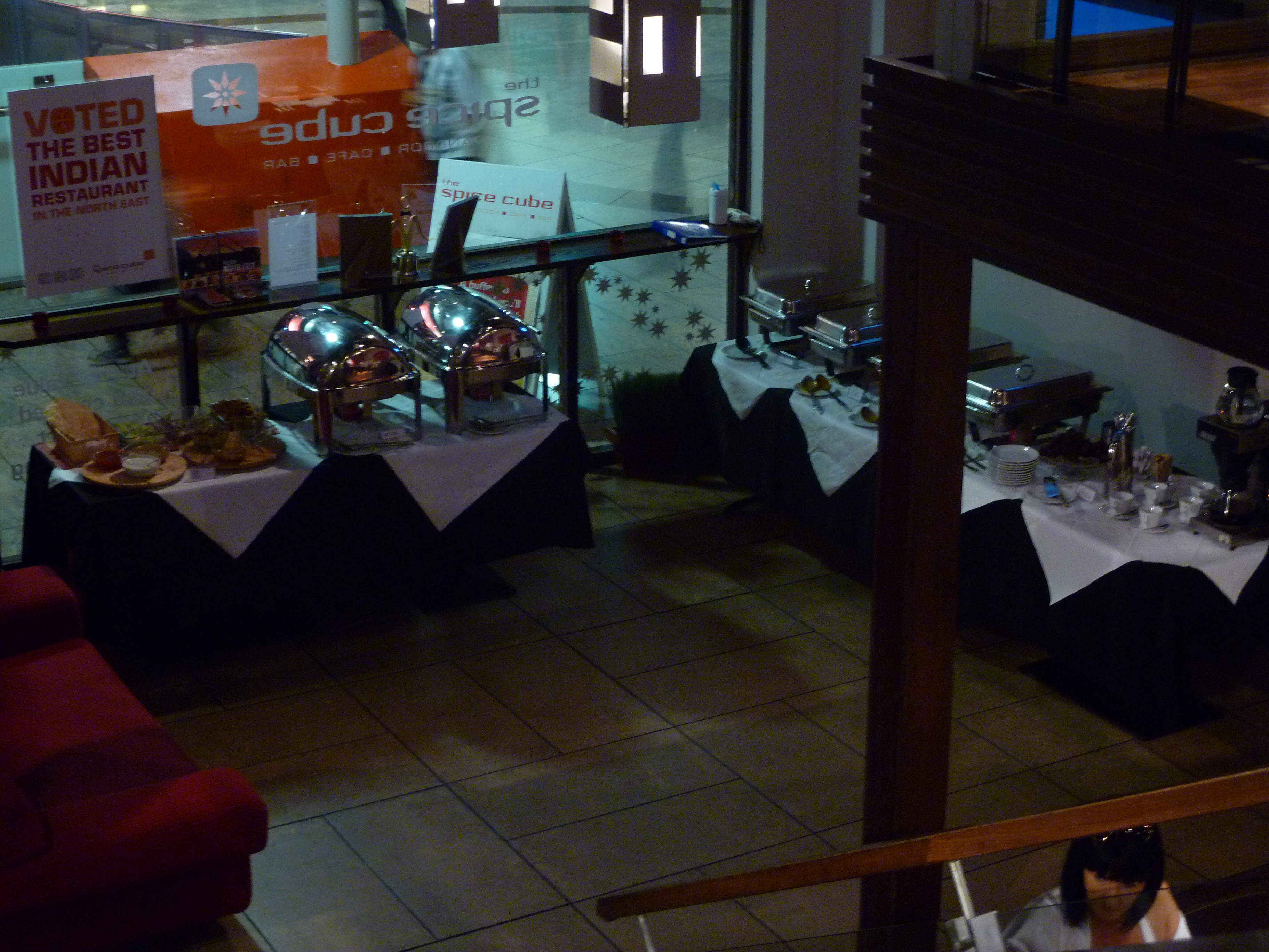Hector was hoping to step off the train from Glasgow just before noon and march the troops for a Curry breakfast. This was not to be. HTC/Android maps were useless today. If I had chosen to go to South Shields all would have been well. Newcastle itself simply would not display on the phone. After some ten minutes the map acknowledged I was within the Newcastle area, accurate to 1600m. I still did not now where I was. The Forth Hotel opened just after noon and the best laid plans were put to rest. Two hours later we were all in need of food. Hector’s phone map had improved its resolution but was still not accurate as to where we were. Howard’s phone (same system) had us standing half way across a famous bridge. Tracey asked a local, ancient technology. We were now no more than a hundred metres to the shopping complex in which Hector believed the Curry House to be sited. Glasgow’s Xscape is quite a complex, this was along similar lines. Upstairs, opposite Nandos lies Spice Cube. Winner of Curry Chef 2010 (Newcastle and regional), and winner of the 2010 British Curry Awards, the place had pedigree. Hector has yet to win an award. We were seven, five ordered the Buffet. Craig, the Man, opted for a Lamb Tikka dish from the main menu.