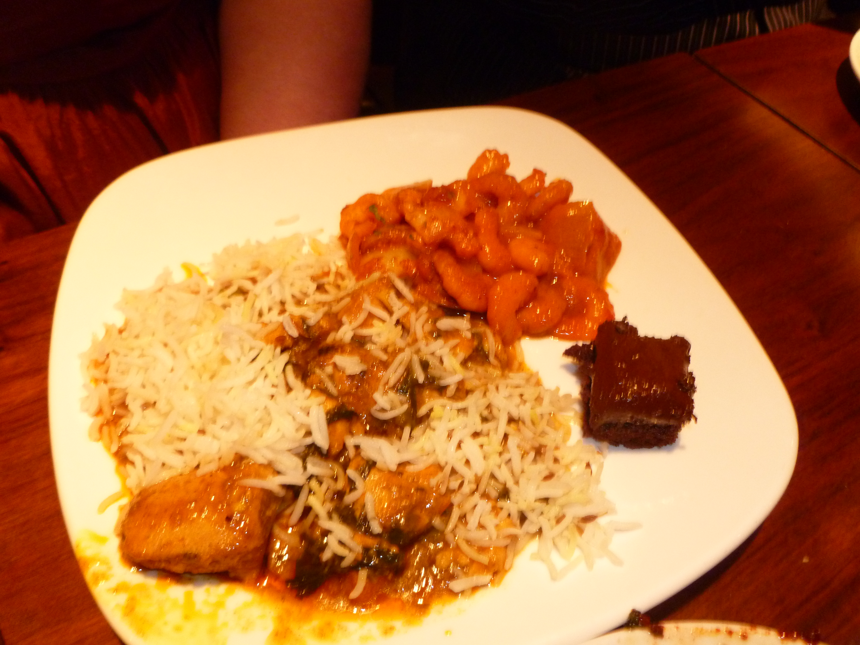 No Bread was available in the Buffet. When the main courses arrived, two baskets of sliced Nan were presented. This was so late, the Buffet Diners thought it was not for them. As was the case in the Verandah (Edinburgh) last Saturday, Hector believes the Chefs only cut their Bread into portions to mask the fact that not very much is their norm. The Nan Bread was far too sweet. Craig’s Lamb Tikka arrived first. No Rice, he had not asked for any, and a tiny pot of something wet was the accompaniment. He thoroughly enjoyed this. The Lamb was dry, virtually no Masala, the Bradford style, or even Crawley as Craig reminisced.