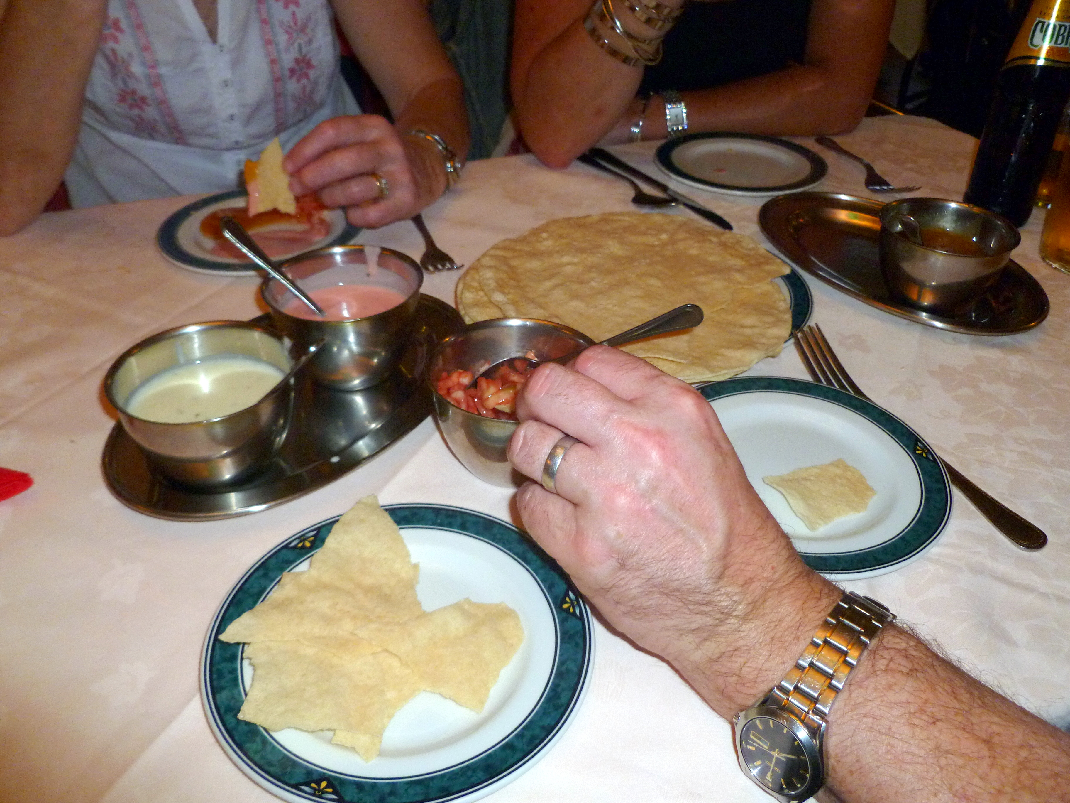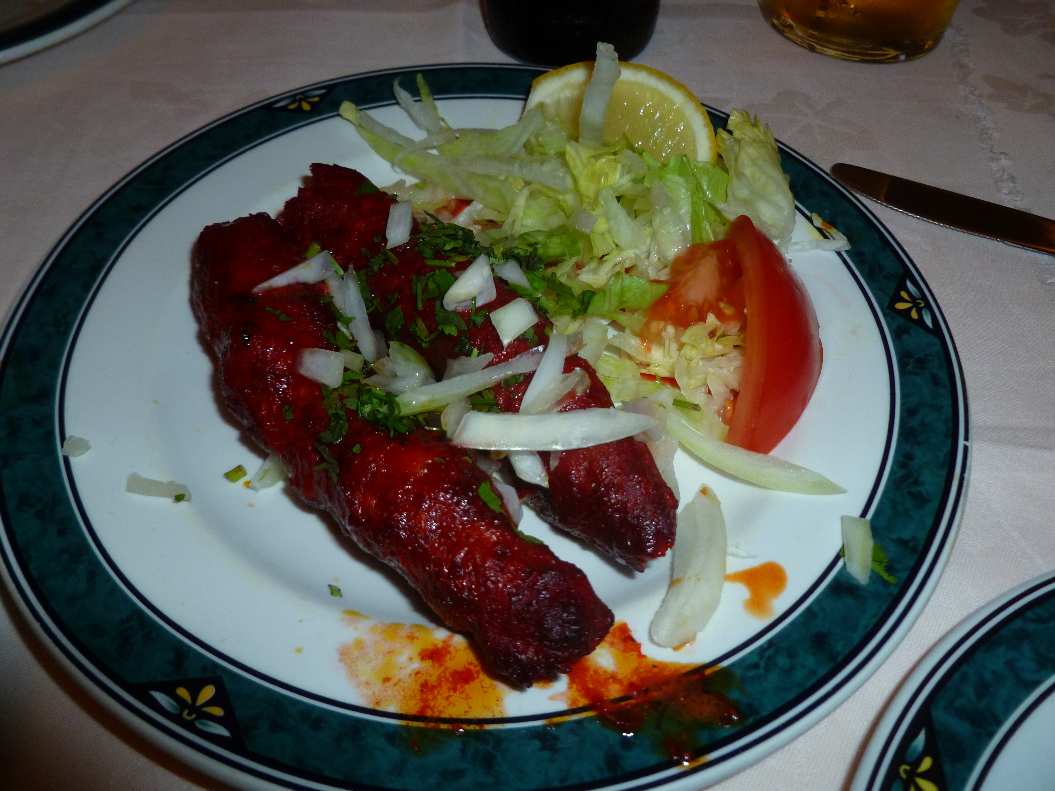 Four Poppadoms and accompanying Chutneys were ordered as amusement whilst we waited for the Starters. Alan and Tracy were to share a Sikh Kebab. Tracey eating Lamb, there is hope? Hector has been ordering the Akash version of Chicken Chat for some thirty years. The dish is unique, sadly it has evolved from its sensational origins, what would tonight bring? Marg stated that she would have some of my Starter, really?