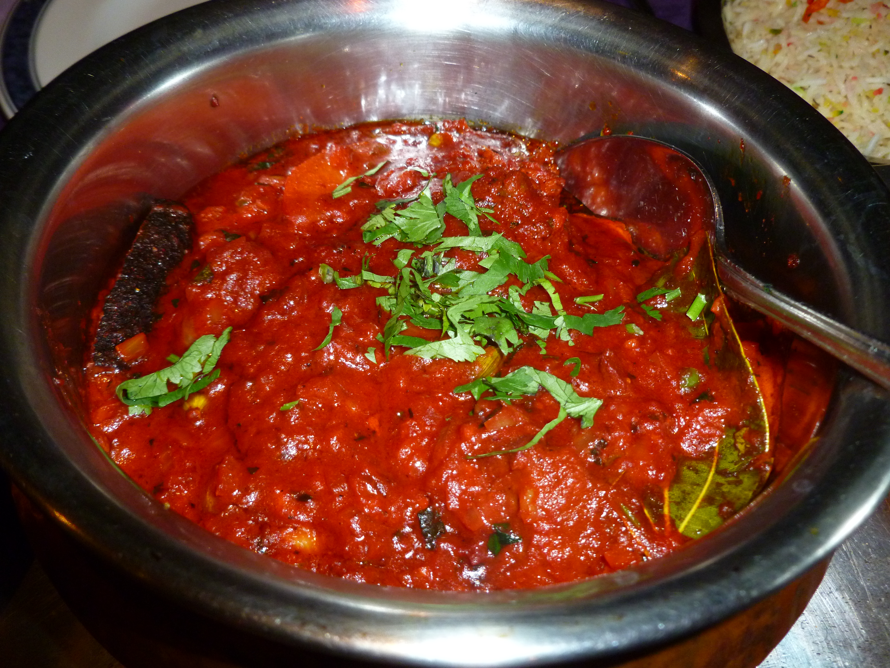 The Curry was a bit on the red side. The Masala was thankfully not soup as I had made clear I did not want. (are you reading this in Newcastle?) There were evident Bay Leafs in the Masala. A significant piece of Cinnamon Bark was also contained therein. Green Cardamoms were to the fore. There had been a clear attempt at producing a genuine aromatic Curry. As I ate the dish some of the individual tastes emerged.