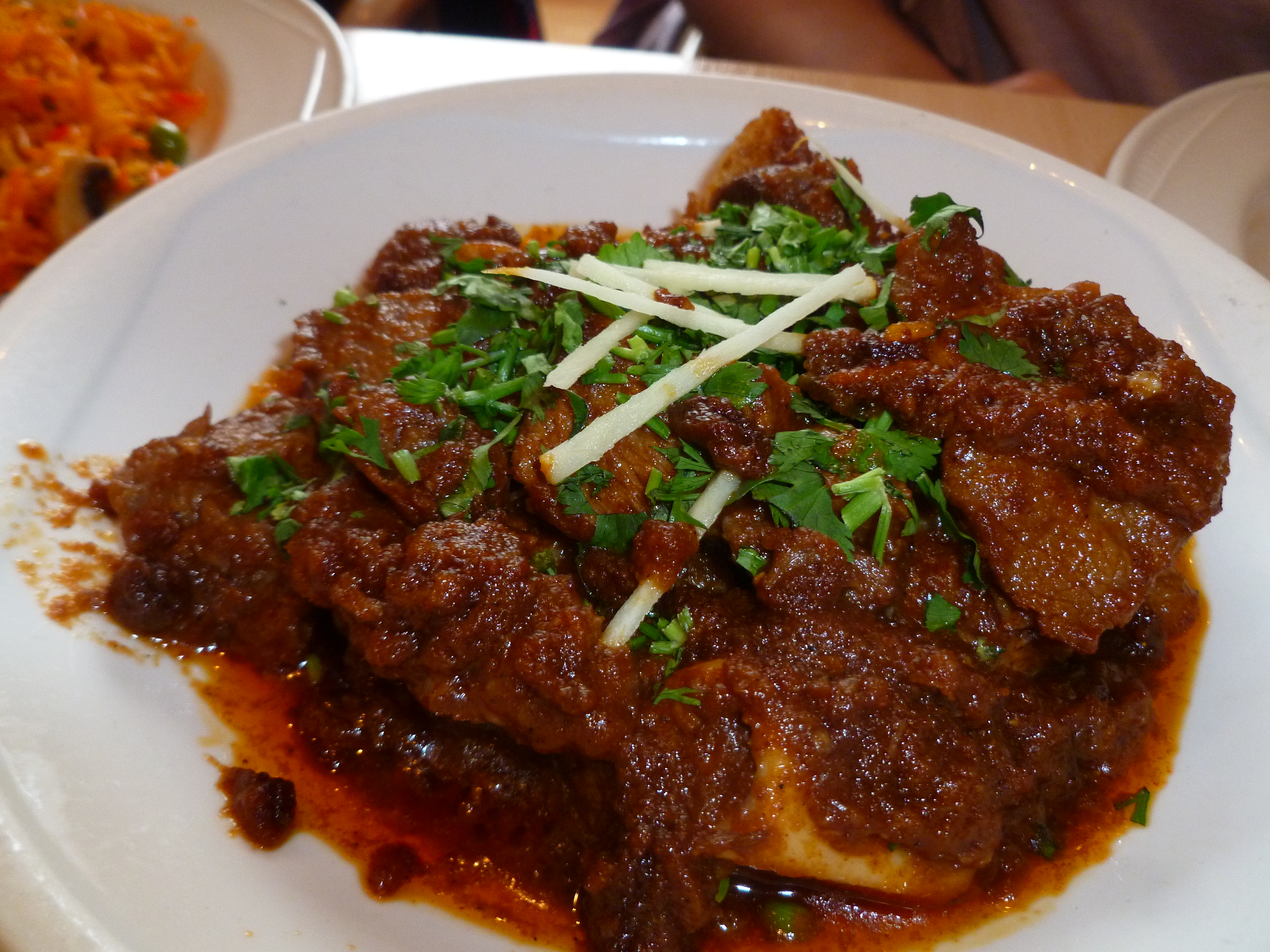 My initial thoughts were that this was not created at the hands of Mr Shah, the Chef Hector thinks is the finest Chef in Glasgow. The normal Yadgar – Goshat Karahi flavour was masked by a the fulsome flavour of Cinnamon. The Lamb was also darker than the norm, or was that a result of the richness of the minimal Masala? The Lamb was tender. No, this needs further emphasis, the Lamb was magnificently tender, no knife was required to cut the larger pieces or separate the meat from the bone.
