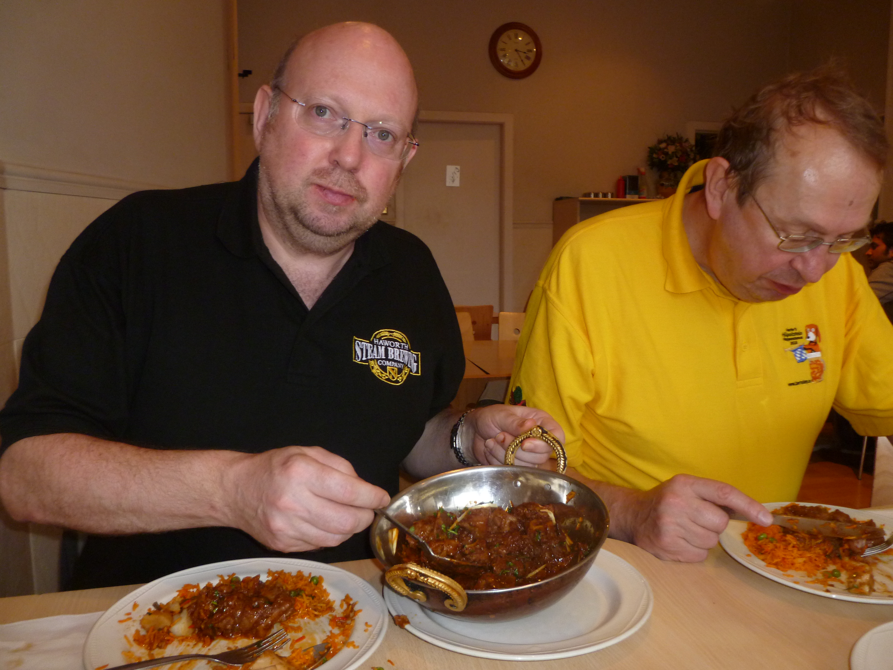 The Complementary Popadoms, Onion Chutney and Salad (complete with Black Olives) were set before us shortly before the official rendezvous time of 15.00. As always, everything had been booked well in advance. Three Vegetable Rice and Four Chapattis seemed enough to complement the One Kilo and Two Portions of this very fine Lamb Curry. ?Stan! and Hector were sharing the Kilo.