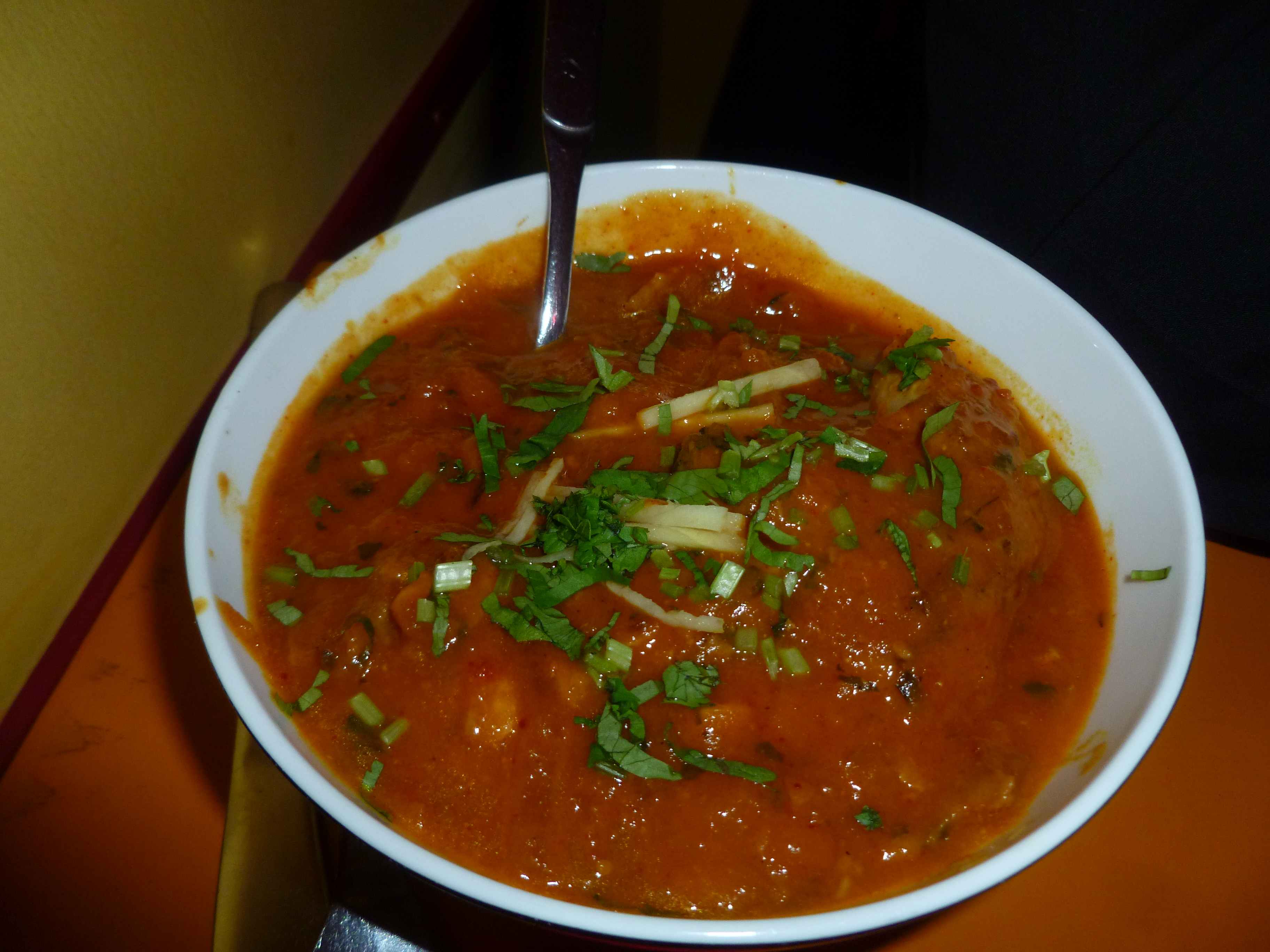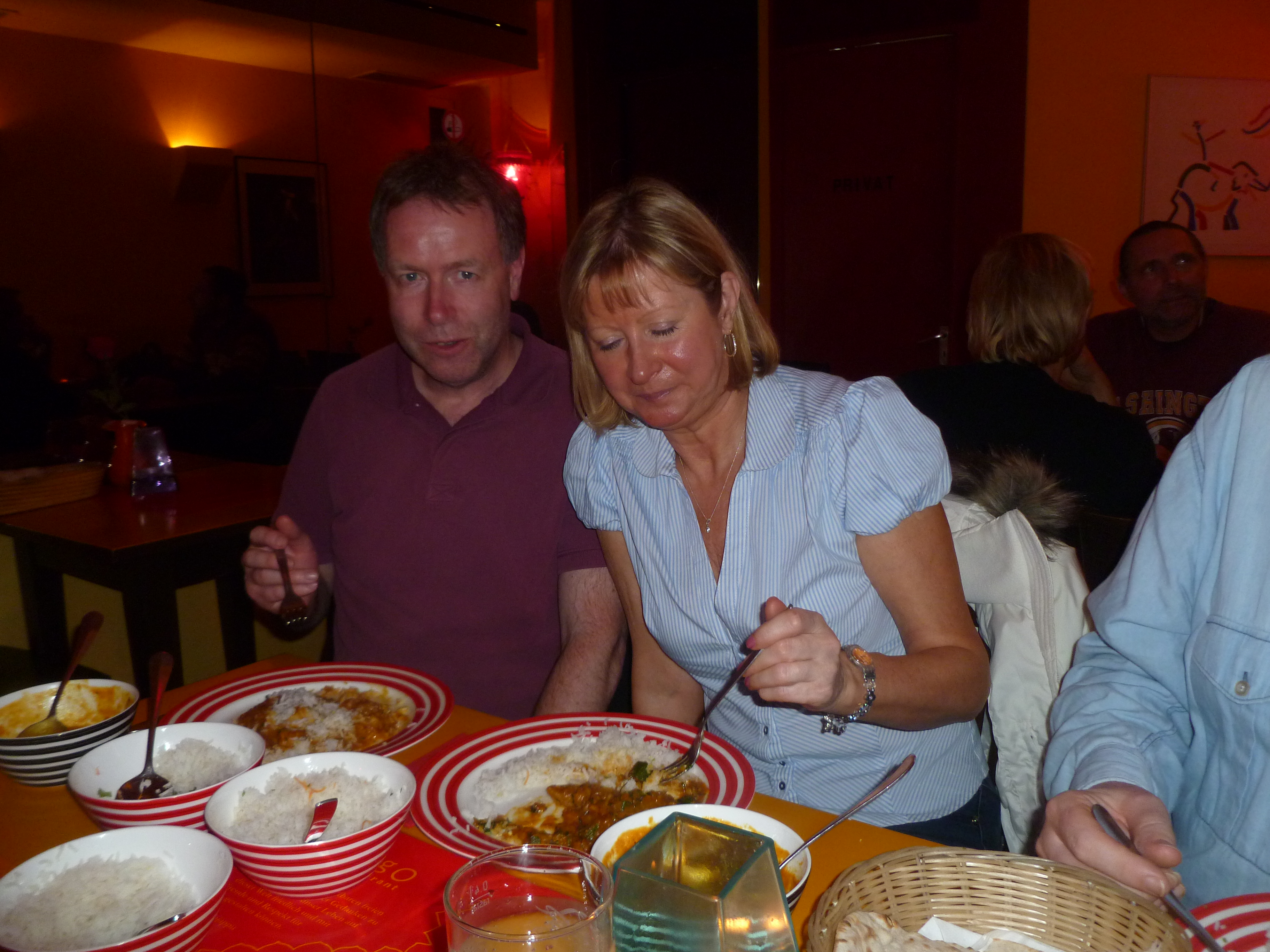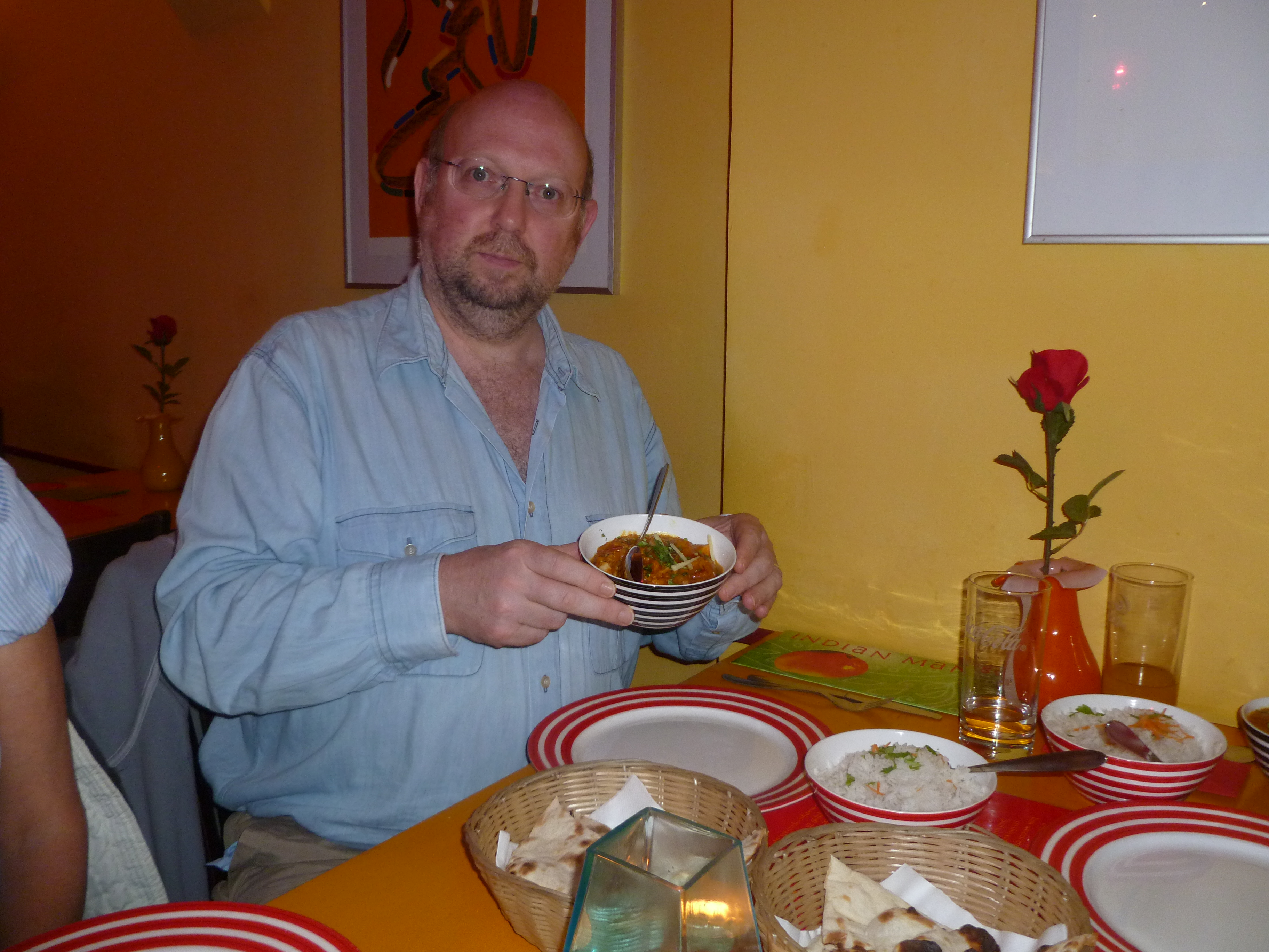 There were two young waiters this time and the Chefs also looked different, they are very young too. 19.40 was Hector and Howard’s ETA from a swift visit to the Forschung Brauhaus. Craig, Yvonne, Juliet and Steve – the man who discovered Mango, were all due imminently. Howard and Hector had soft drinks whilst we waited. This wonderful Curry House does sell Bier, but we were here for the Curry.