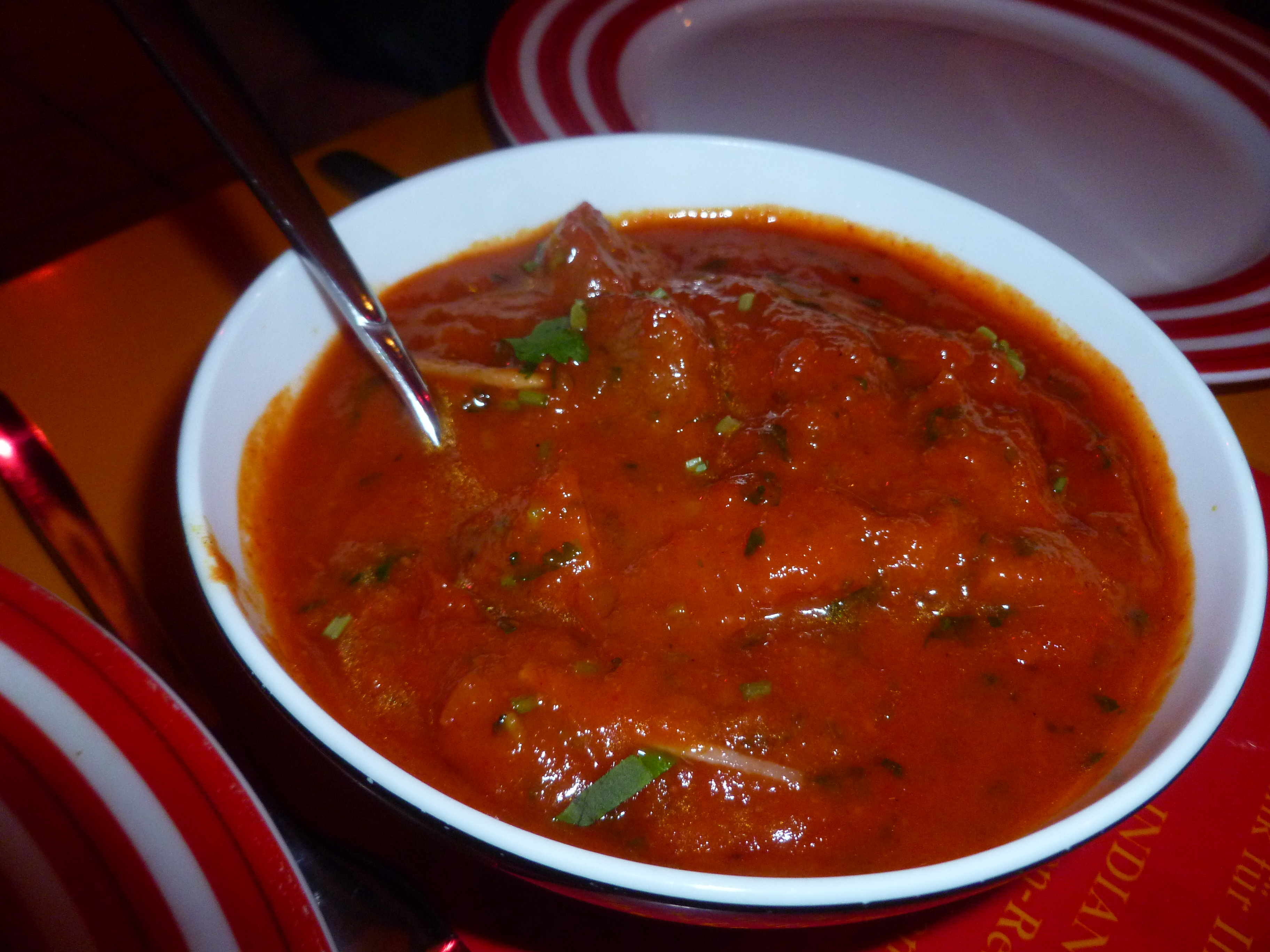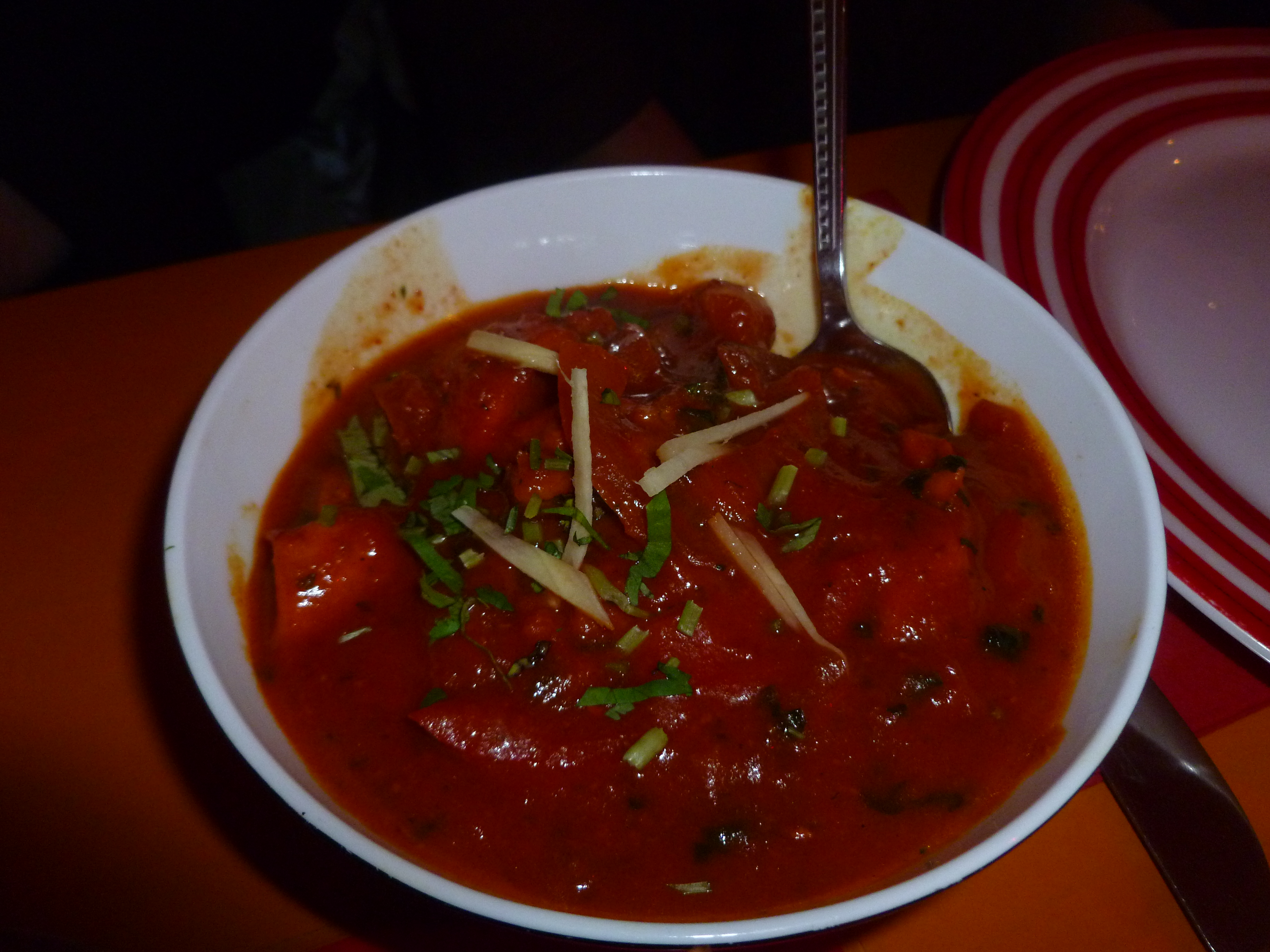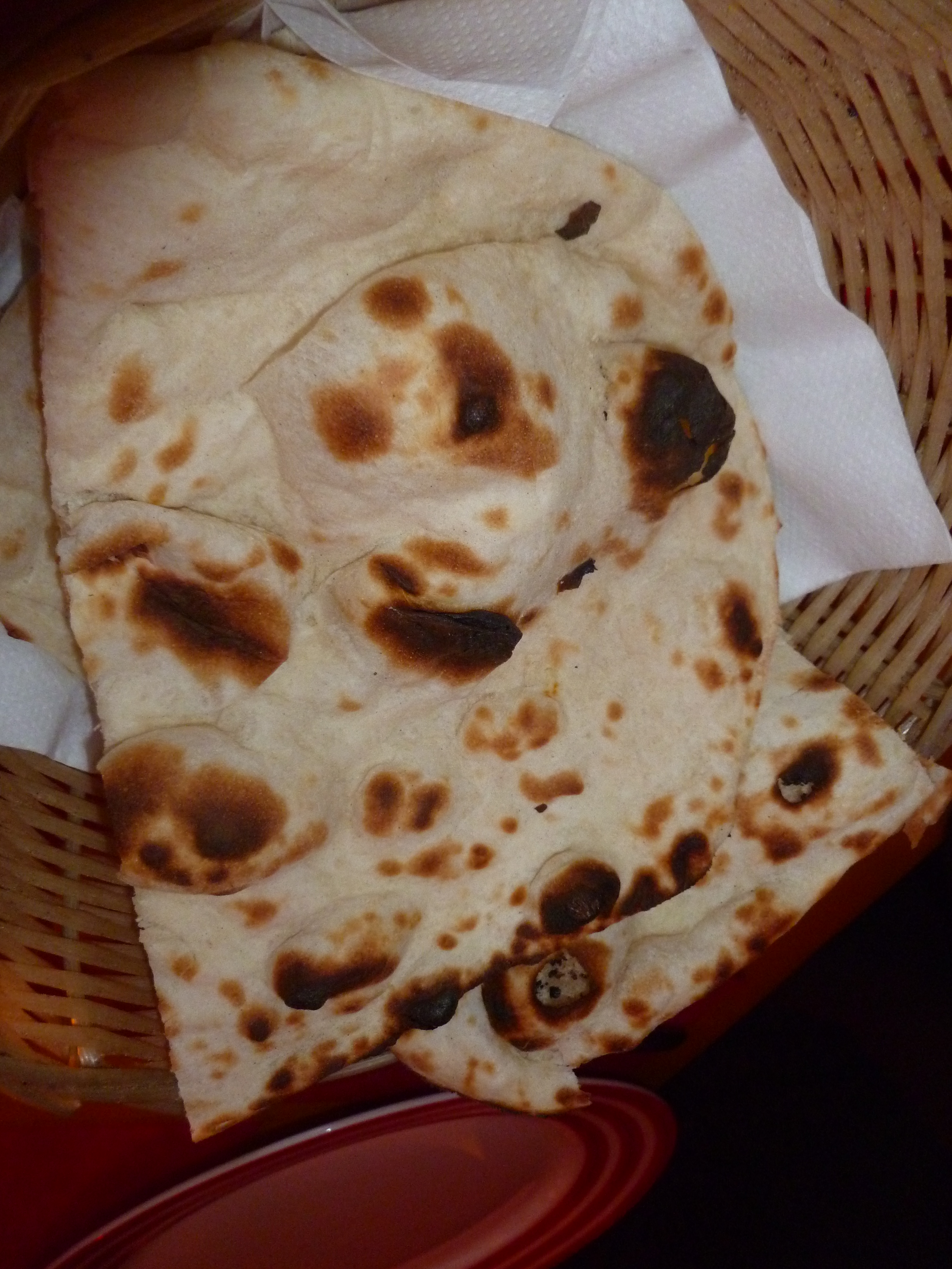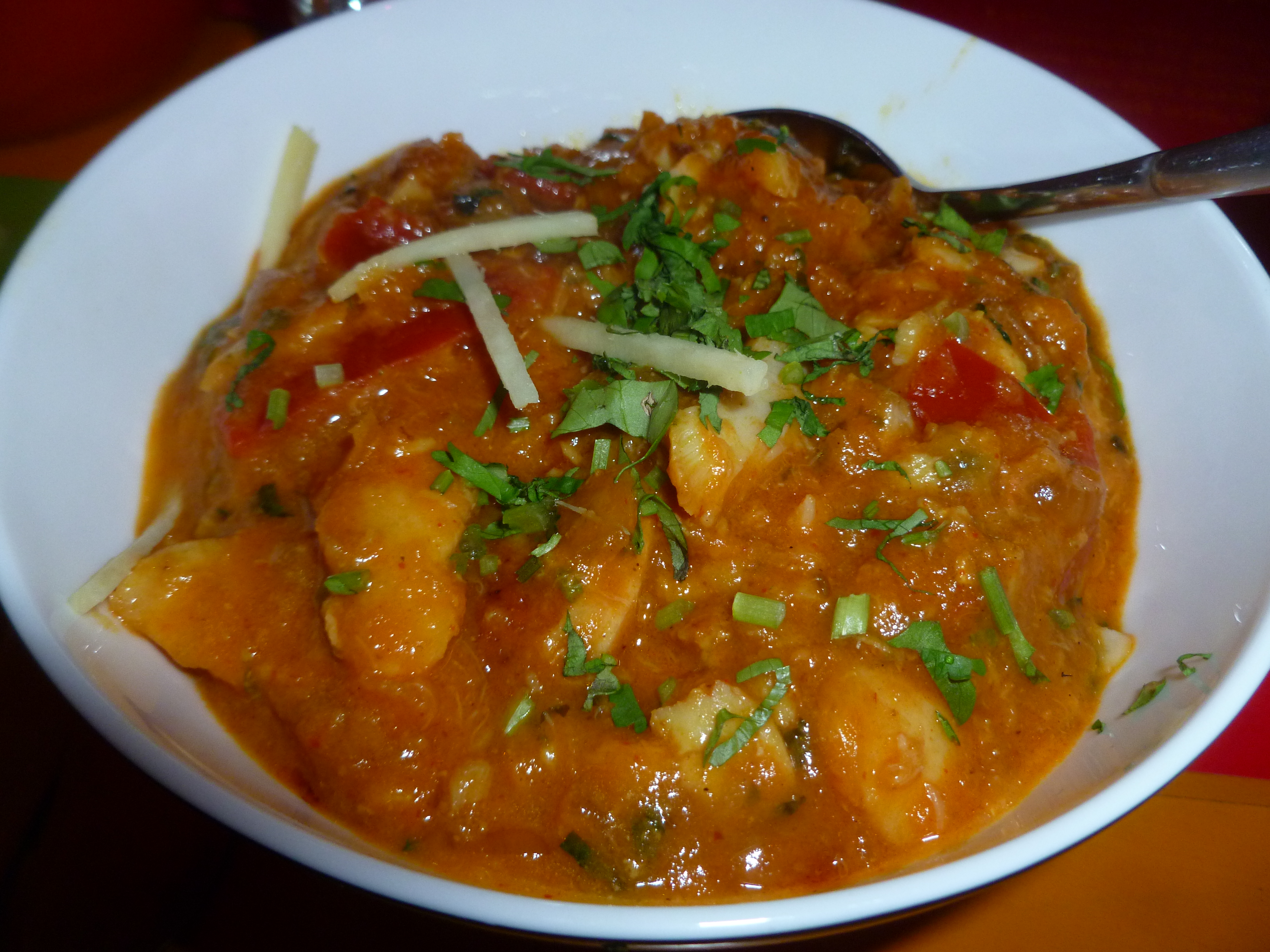 The Spezial’s Board was gone, in its place was a laminated additional menu. The Fisch Chettinad would be Hector’s meal of choice. This was from the Spezial menu and at €14.90, not a cheap option. Howard had the Fish from the normal menu as did Craig. Steve opted for the Lamb Vindaloo, Yvonne the Bhindi Gosht, and Juliet the Chicken Jalfrezi. (Chicken!?) Two Roti and a Nan were also ordered.