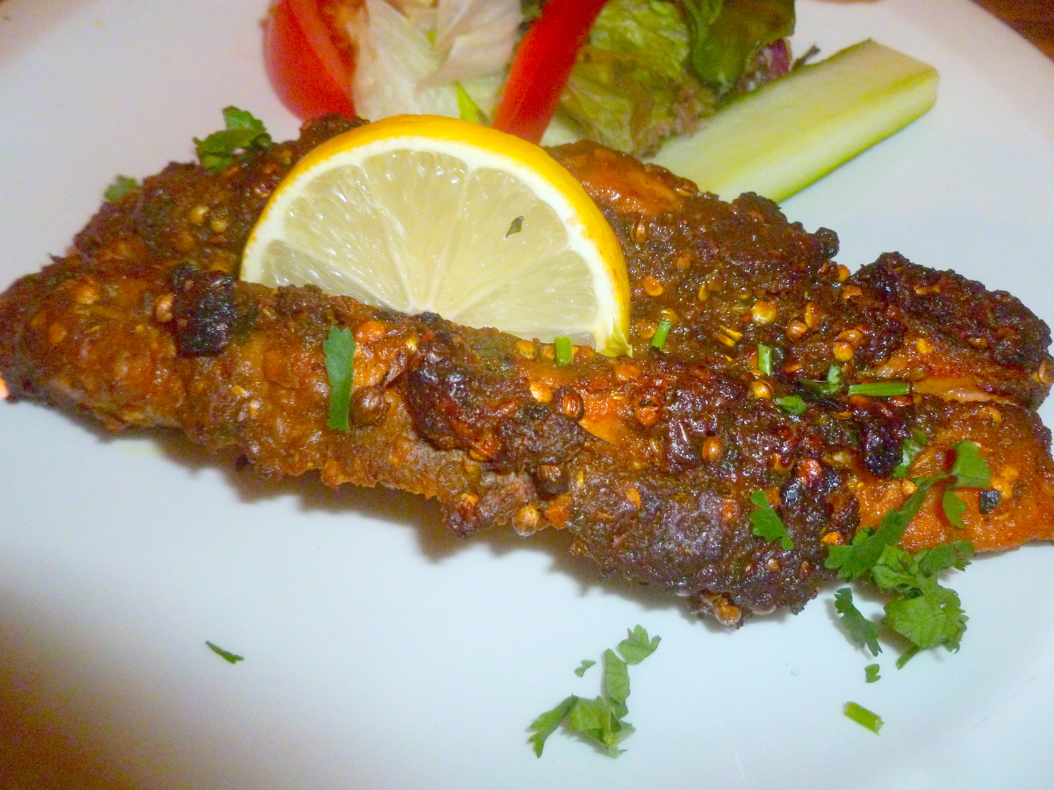 The Masala Fish at £5.95 is an expensive start to a meal. Tonight the appetite was sure it would be justified. What came was a Pink Fish (on the inside) encrusted with Herbs and Spice. It looked evil, it tasted wonderful. I shall have this again.