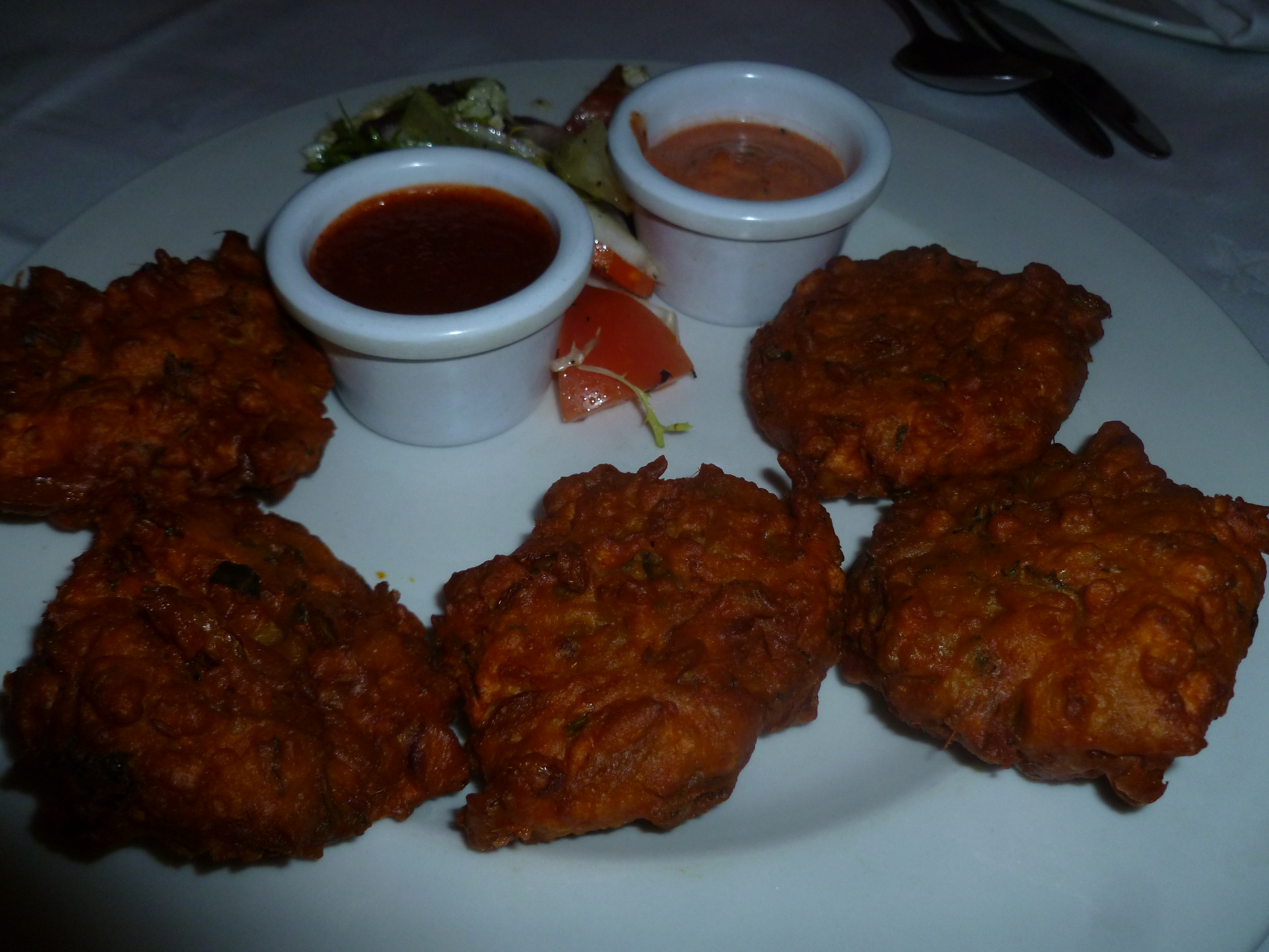 One portion of Pakora was ordered, this came quite quickly. The Pakora was flat, pattie style. I restrained myself, I was here to sample the Curry. The ladies enjoyed the Pakora but stayed clear of the Red Sauce.