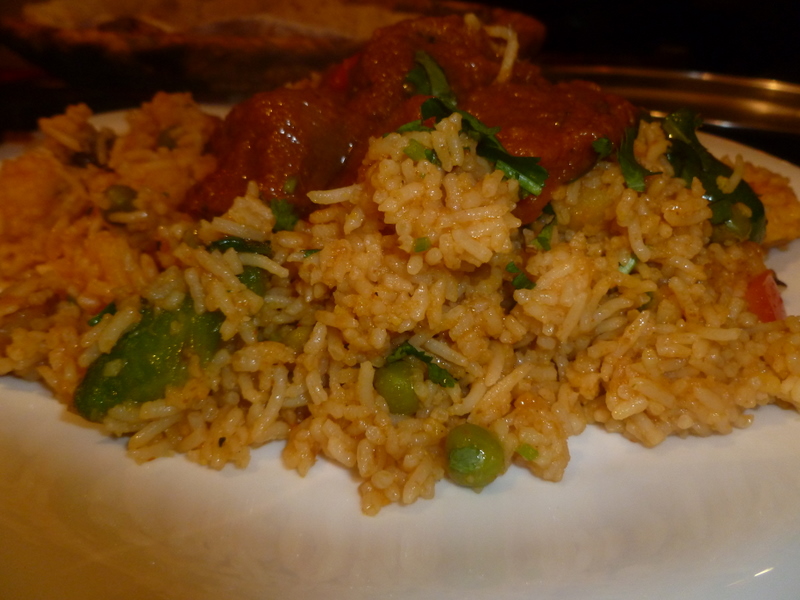 With the nibbles and reading matter removed, the meals were brought to the seemingly shrinking table. The Veggie Rice looked a bit on the stodgy side this evening, very unusual, but the Rice was fine and the array of Vegetables is what makes it a compulsive eat. Spooning on some Lamb and the very light and almost sticky Masala I put myself in a dilemma: to dip the Chapatti in the Karahi or eat a spoonful of Lamb and Rice. The former ritual held and we were underway. The flavour from this Masala is truly wonderful, slightly sweet, but only very slightly. The Lamb pieces looked huge in comparison to where I have been eating of late, this is certainly not the Bradford style.
