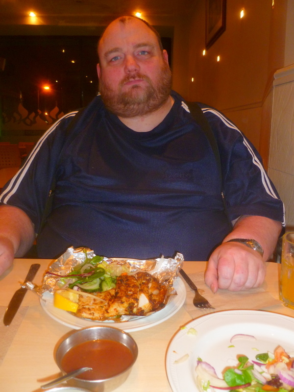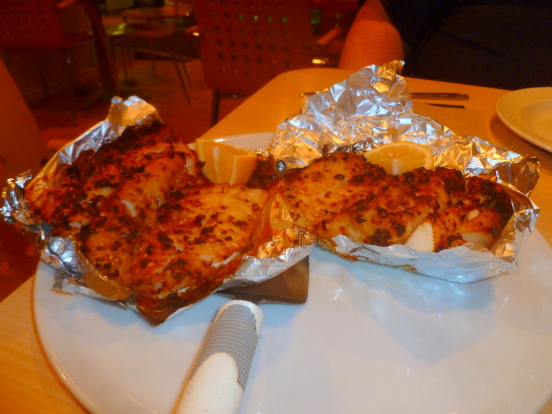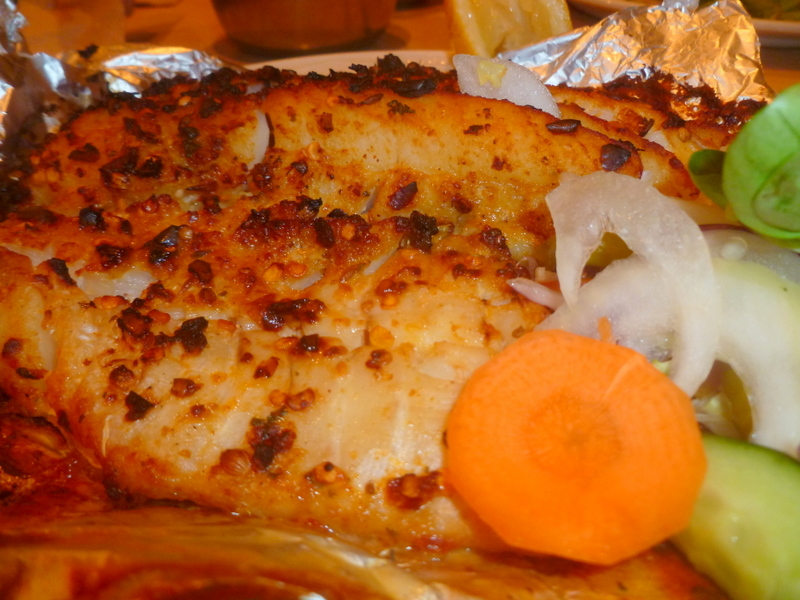 The Fish was presented as two foil packets – ‘A nice piece of Scottish Cod’ – was the introduction to our Starter.  Shkoor then served each of us with our very generous Fish Platter.  Hector has had Fish in this style in other outlets, it has never looked this good. At a typical £6 per portion for half of what was before us, we once again  knew that we in for a treat.   The Lemon was squeezed over the mass of Cod: to add a Dip or not, no let’s taste it as it comes.