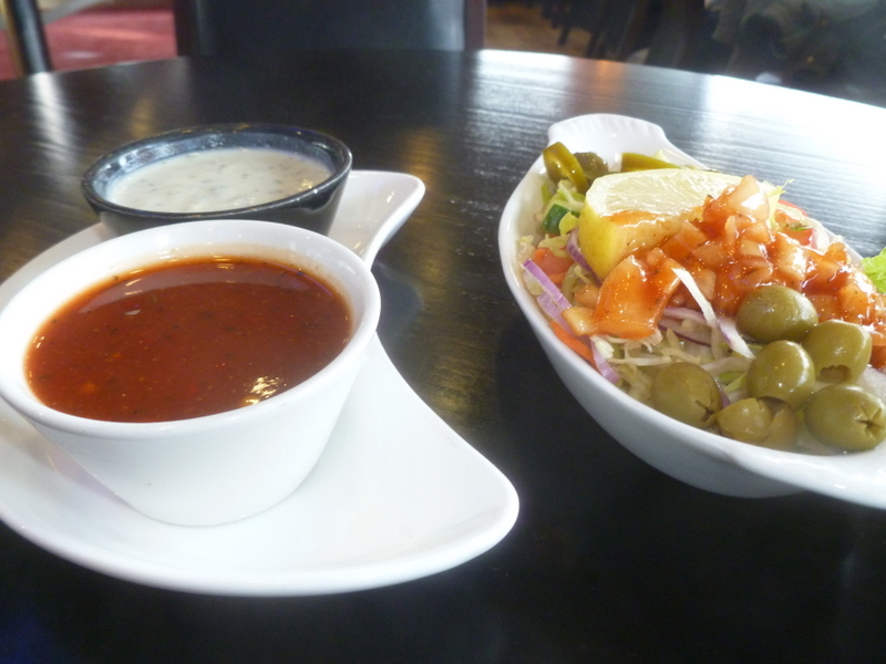 More people entered and were sat on the edge of the throng, amazing. Am I part of some sort of Cosy Curry Convention? The meal did not take too long to arrive. It was preceded by a Salad and Dips which I looked at and was somewhat baffled by. The presence of Olives made me immediately not wish to eat it until the Curry arrived. My only other Olive in a Curry experience at the Meghna in Blairgowrie came to mind, this works.