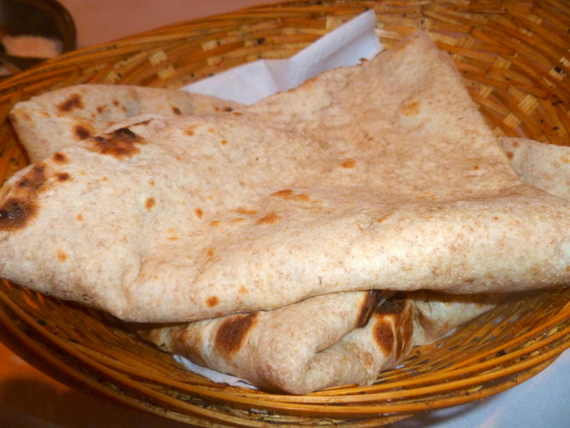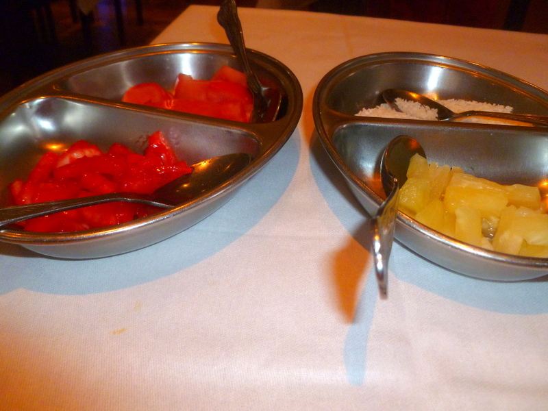A different waiter brought the bits: main course, Chapattis, and two trays with fresh Tomato, Onion Chutney, Coconut and Pineapple. Is there an African influence?