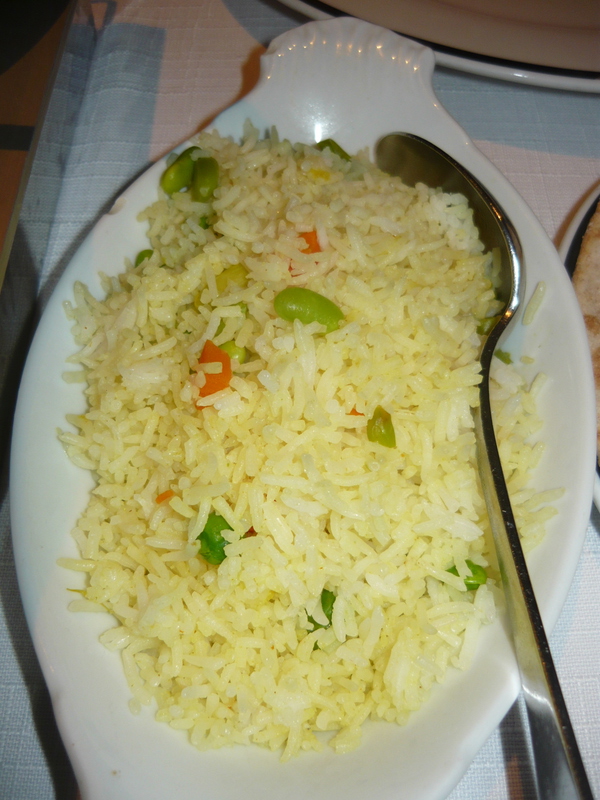 About four other tables were occupied when we entered around 20.00. A table for two it was then. The menu was quite limited. For Hector it was normal Lamb Curry or Gosht Vindaloo. The latter felt the better option. Marg went for the Lamb Roganjosh, the presence of yoghurt having put me off. I asked the Doris if there was anything else. I also asked if Dry Curry was possible. I was advised that all the Curry comes with Sauce unless I chose the Grill. I was tempted for a moment but then it was a Curry I came for. The thought of Meat and Sauce with nothing else made me order an extra Main Course – the Legume Curry. This was only €2 more than the Side Vegetable dishes. As usual we agreed to share a Vegetable Rice. Here it was referred to as: Saffron-flavoured basmati rice and vegetables.