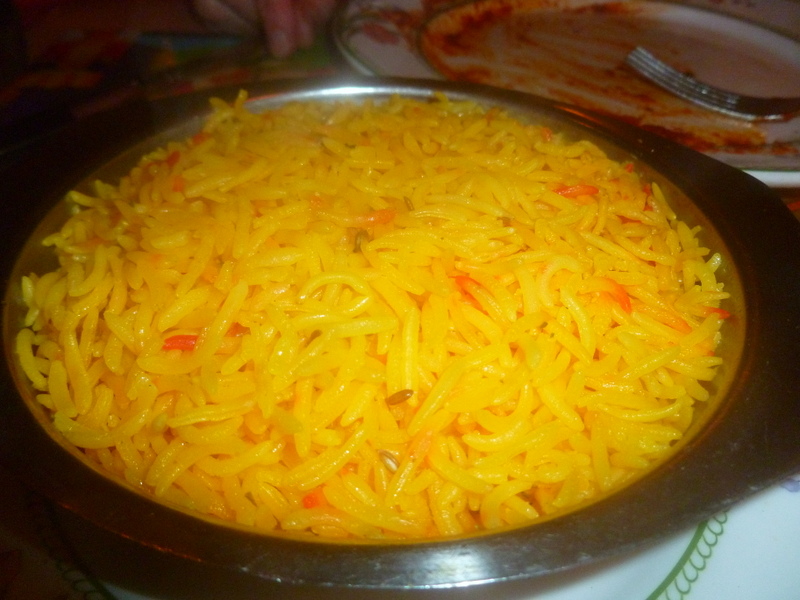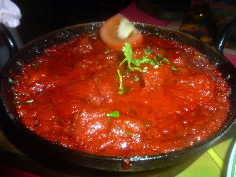 When the two cast iron karahi dishes were set before us, the Redness was not that apparent in the ambient light. Marg thought the Masala to be excessive and so immediately ordered Pilau Rice. Now if Marg though it wet… Hector had hoped for something Dry and Brown, but here we go.