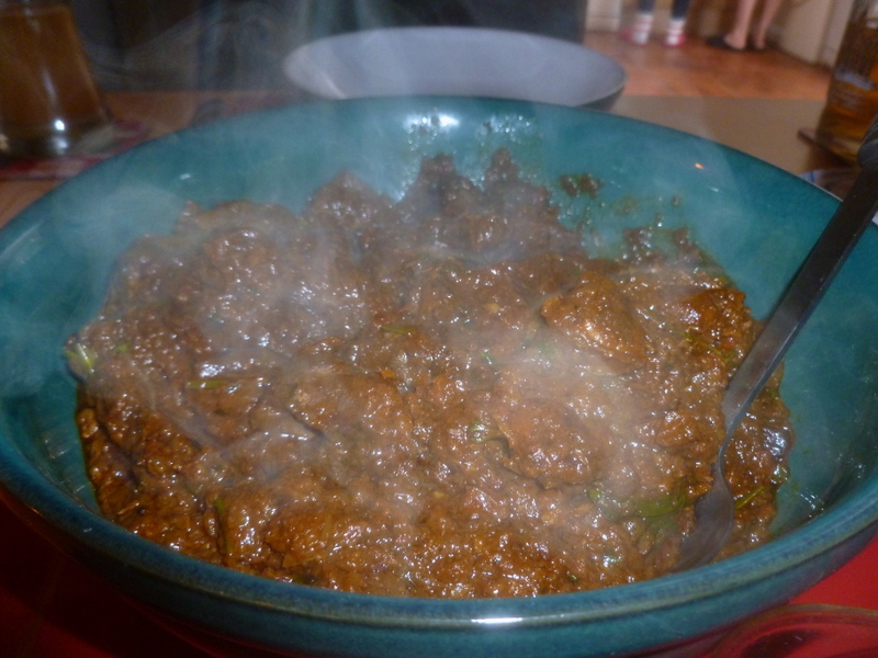 Mini Poppadoms were an interesting variation. Yvonne’s own Onion Chutney takes no prisoners. Lime Pickle too, more indulgence. When it was time to declare the Starters to be over, Hector refused to let the leftover Onion Chutney leave the table. A compliment.