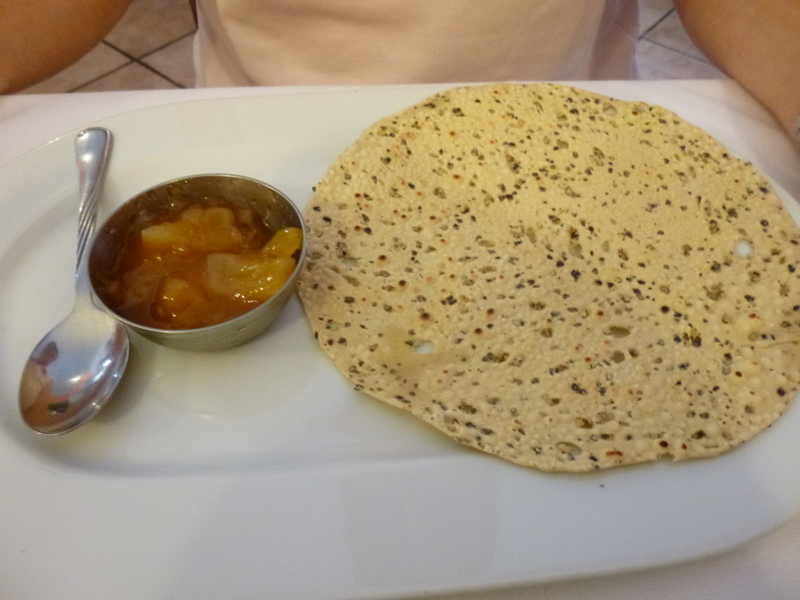 Marg’s Chutney and Poppadom was brought some time after another Poppadom had been set before us. There was some concern that Marg was not eating – I had to resort to English to explain all was well.