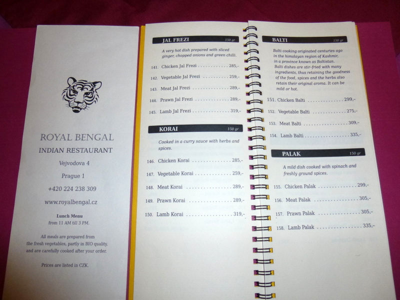 Around the corner from a famous Prague Pub – U Vejvodu and a few metres more from Hector’s favourite Prague Bier outlet, U Medvidku lies Royal Bengal (Vejvodova 4, Prague 1). Marg and Hector found it by chance yesterday and noted that it would be open all afternoon today, the decision was made to come for lunch. Well I would have lunch, Marg may or may not participate.