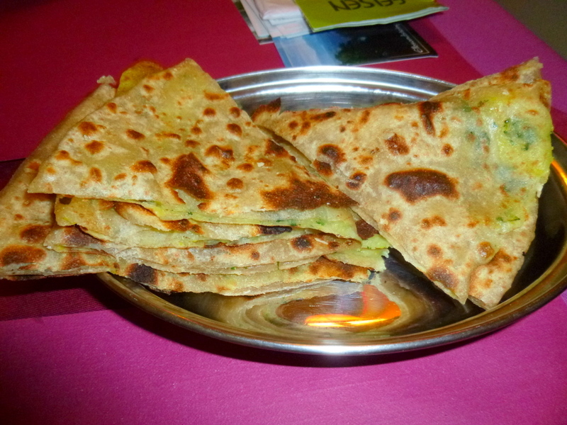 When the Waitress brought the Menu Marg decided that Vegetable Pakora (3 pieces the Menu said) would be a suitable snack. The Korai was ordered with an Aloo Paratha. The Breads were all a reasonable price. I was glad to discover that the Sparkling Water was also sensibly priced, it was too early for Bier, they serve Pilsner Urquell on draught.