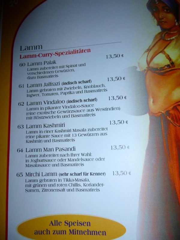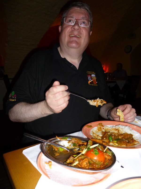 Howard’s Chilli Suwer was very much a Stir Fry, so technically not a Curry at all. There were Strips of Pork but they were greatly outnumbered by the Vegetables, Capsicum being to the fore. This would never have been my choice, but it wasn’t really Howard’s choice either. To quote Howard – If I had found the Curry I might have enjoyed it, but it was a Stir Fry, not a Curry. The one reason I came to Passau was to try the Lamb Saag.