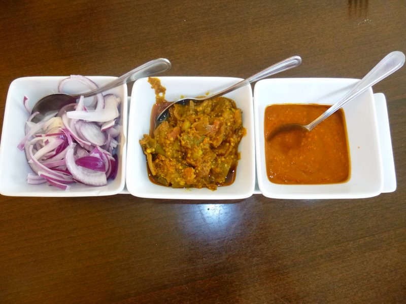 As was the case on my last visit, the meal included Rice with a piece of Poppadom for good measure. This could, if one chose, be eaten along with the Onions and Dips already on the tables, not today.