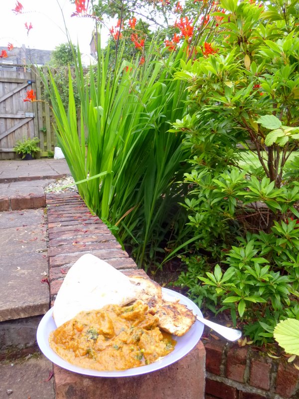The Delivery Chap arrived punctually, Hector decided to assist in the opening of the large meal parcels. As luck would have it the first bag I opened contained the Lamb Karela and so with a generously sized Chapatti and a piece of Chicken Tikka, I retired to the garden. Howard followed close behind with an identically composed platter. It was good to see Howard finally get his first choice of Curry. He has missed some splendid meals in the last few days however.