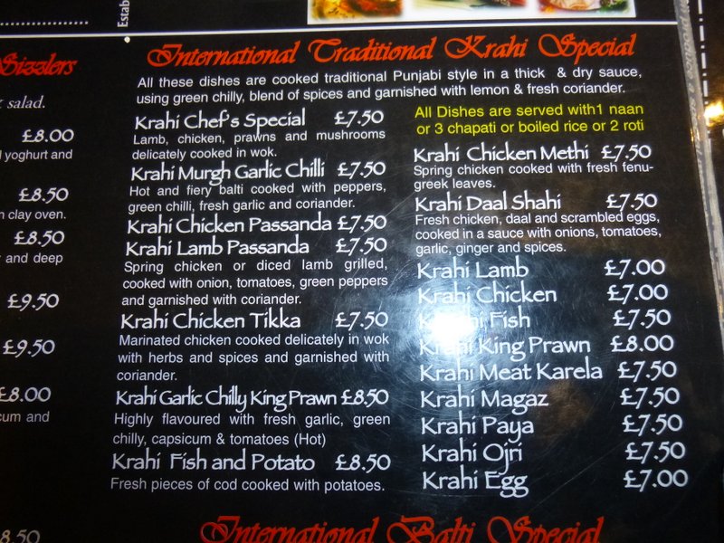 The Lamb Karahi Methi served in this establishment is possibly the best Curry I have ever eaten, so the level of expectation was high. On my last visit in February, the Lamb Desi disappointed, so they are human. John chose Lamb Achari, Lynda went for Lamb Spinach Balti and Tony a Chicken Bhuna. A plate of Chips was ordered for the Young Lady. One Nan was ordered, the inclusive Chapattis were sufficient for the majority.
