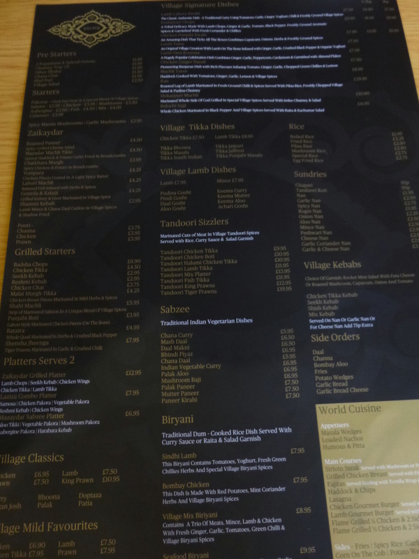 I was shown to a table for two at the beginning of the new vast eating area. There were about a dozen co-diners. The Takeaway business remains steady; everything there is so new and shiny. What an improvement! The Head Waiter – he was not wearing the new Village Curry House shirt, recognised me. This took me slightly aback. This is my first Village Visit this year! Given the frequency of my custom over the last six to seven years it was slightly embarrassing.