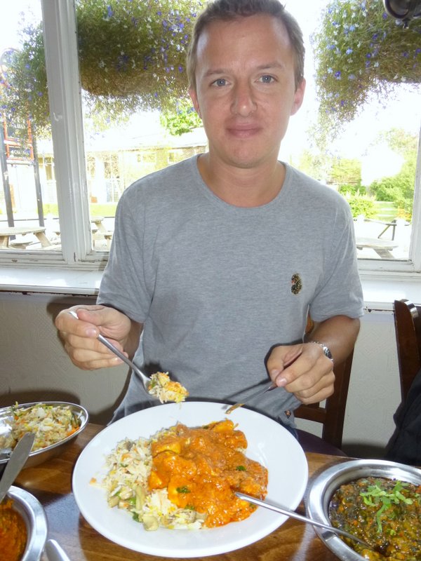Ross ordered Chicken Achari, a Side of Saag Bhaji and Vegetable Rice. The Saag Bhaji looked like a typical Spinach Curry. For once I declined the offer to sample, a desperate attempt to let the food go down. Maggie is convinced that the photo of Ross will increase the Hit-Rate on this site. He looks like his Mum… Yes, that is him on the BMW too.