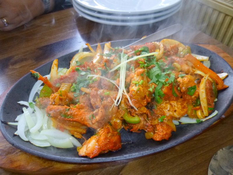 The Roshan Ada Murgh arrived on a Sizzling Platter. The Chicken was coated in Spice, the rest was large-ish pieces of Onion and Capsicum. Maggie was determined not to eat the lot as time was passing. She enjoyed the dish but let Ross tuck in when he arrived.